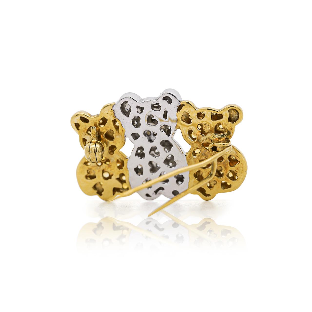 Three bear motif brooch in 18K yellow and white gold featuring pave-set white and yellow diamonds with black sapphire accents. Convertible design functions as brooch or pendant, measuring 1.3 x 0.9 inches and weighing 13.6 grams.