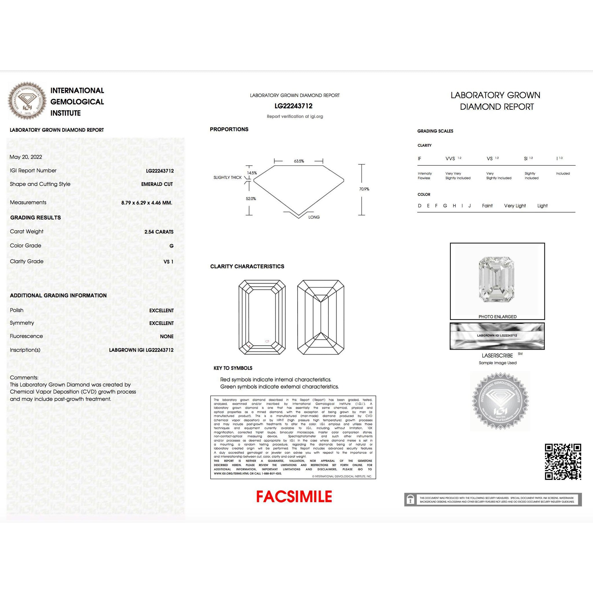 2.54 CARAT Emerald Cut Lab Diamond Engagement Ring in platinum. Emerald cut, G color, VS1 clarity.