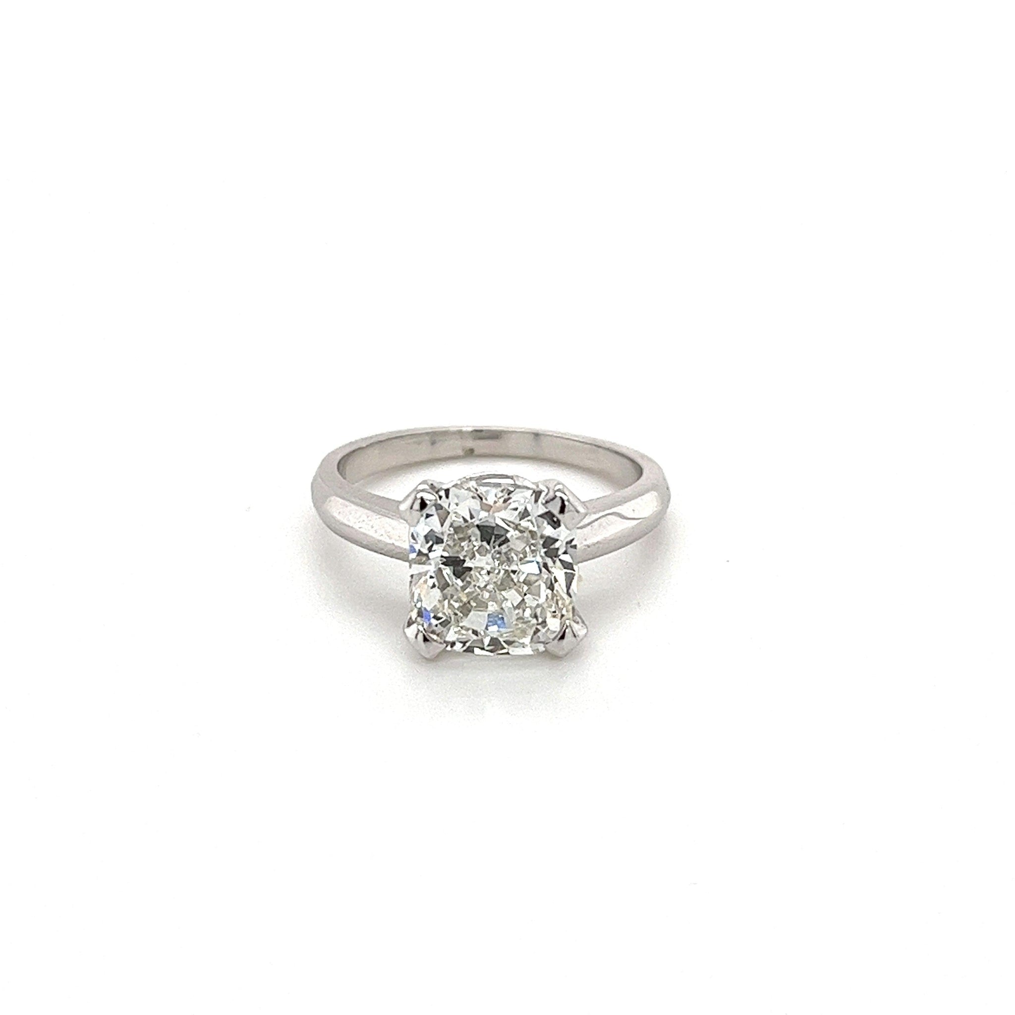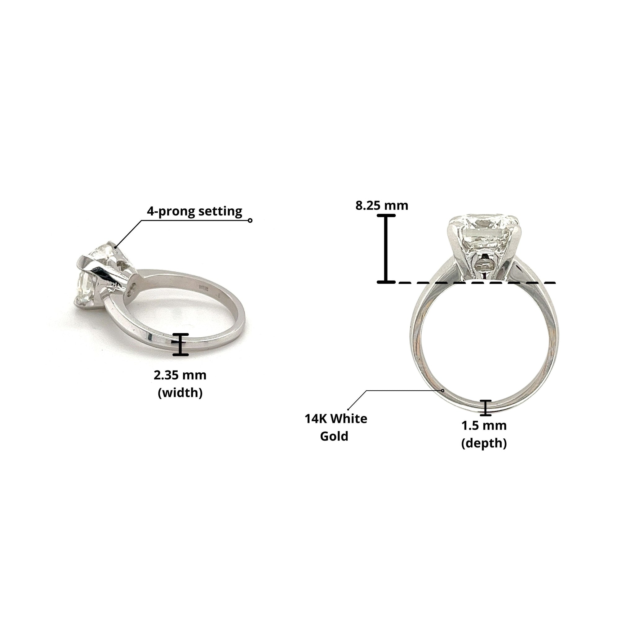 4.05-carat cushion cut Lab-grown diamond solitaire engagement ring in 14k solid white gold. 4.05 carat, cushion cut, F color, VS1 clarity. A symmetrically spread stone with the ideal cut ratio. Not too long and not too wide.