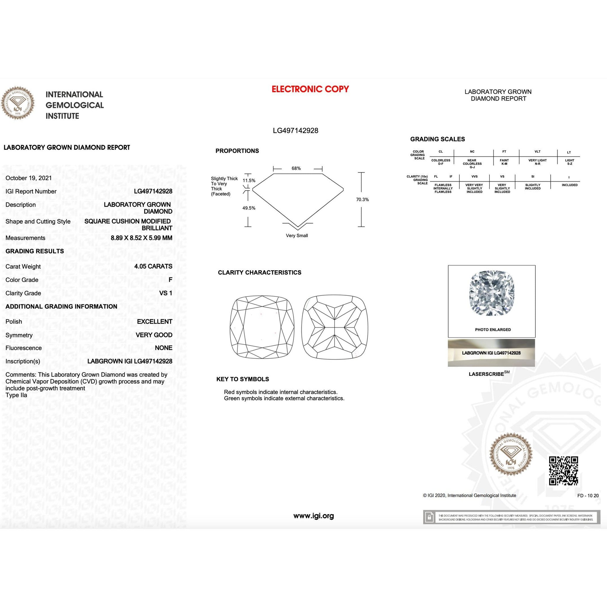 Ring سوليتير من الألماس المزروع في المختبر Cushion 4.05 قيراط، لون F، درجة وضوح VS1