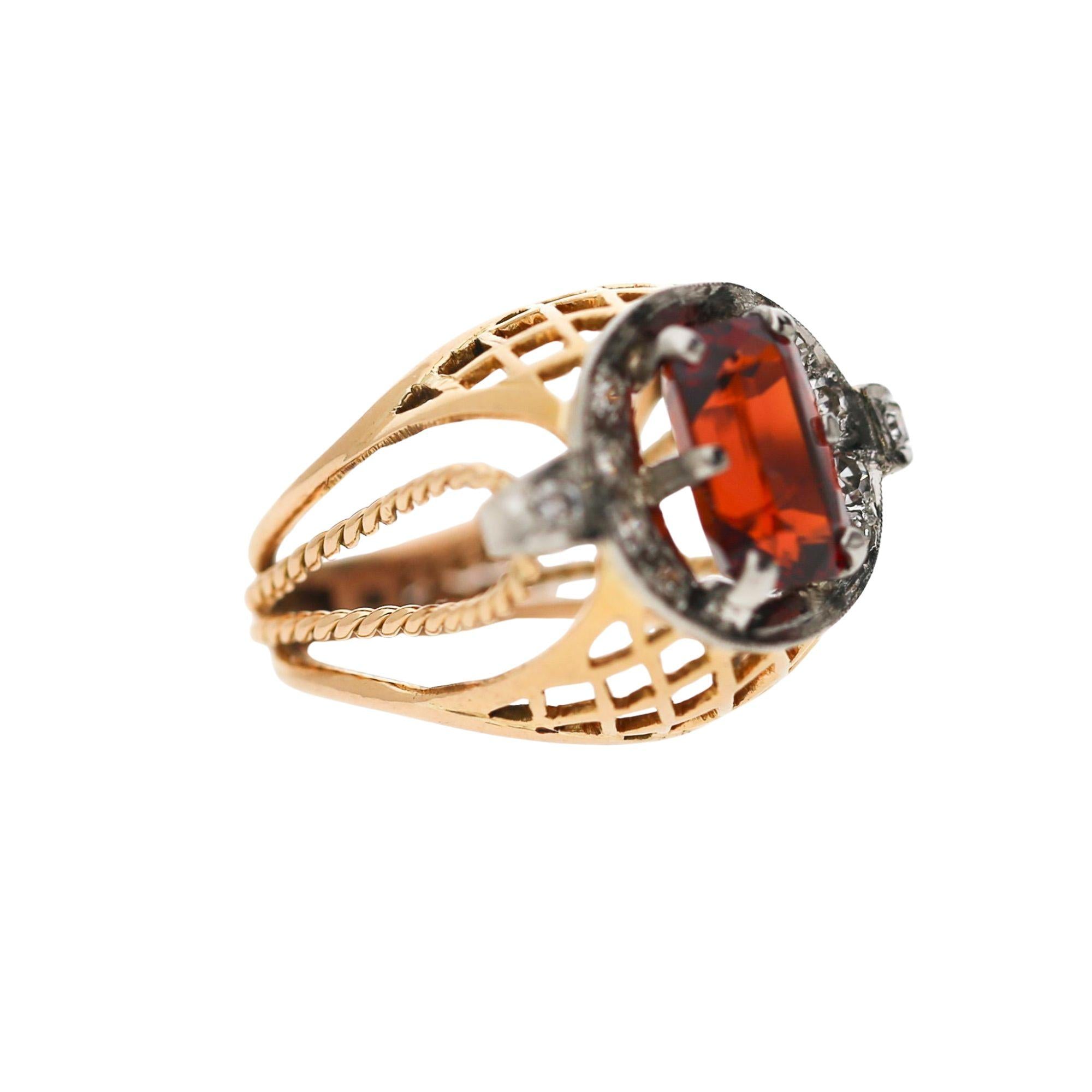 The ring's most distinctive feature is its wide open lattice band — a dramatic architectural shank crafted in 18K rose gold with a woven crosshatch trellis pattern that allows light to pass through the sides, reducing visual weight while creating extraordinary textural depth and shadow play on the finger. The white gold crown rises 9.3mm above the band in a high cathedral-style elevation, holding the spessartine garnet in an open multi-prong setting flanked by pavé and prong-set white diamonds along the shoulders. The contrast between the warm rose gold lattice body and the cool white gold diamond crown creates a sophisticated two-tone composition that frames and complements the intense orange-red of the spessartine center stone perfectly.