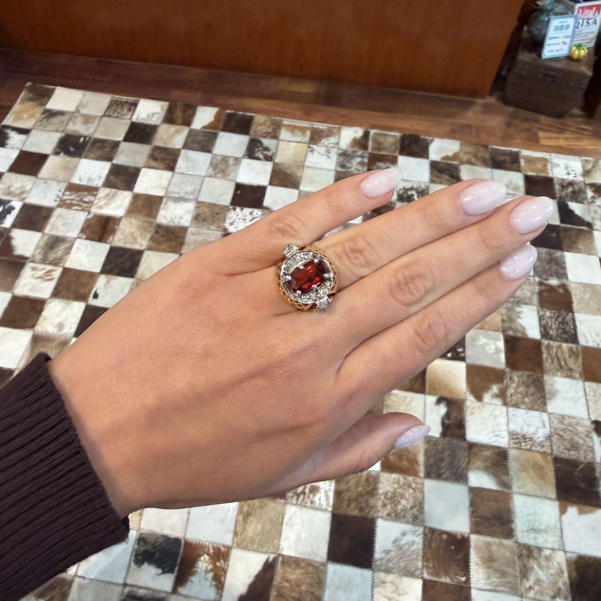 A bold 18K two-tone rose and white gold cocktail ring featuring a vivid 4.65 carat cushion-cut spessartine garnet center stone set within an old euro cut diamond-studded white gold crown, elevated 9.3mm above an open lattice-work wide yellow-rose gold band. Size 4.5, adjustable, with an 8mm band width.