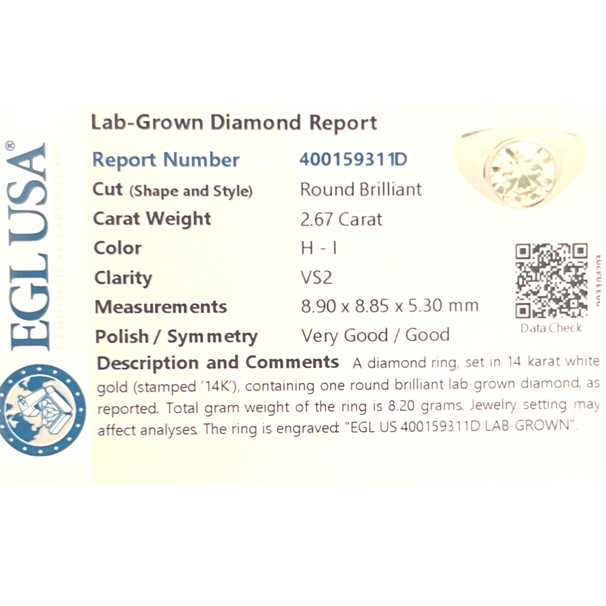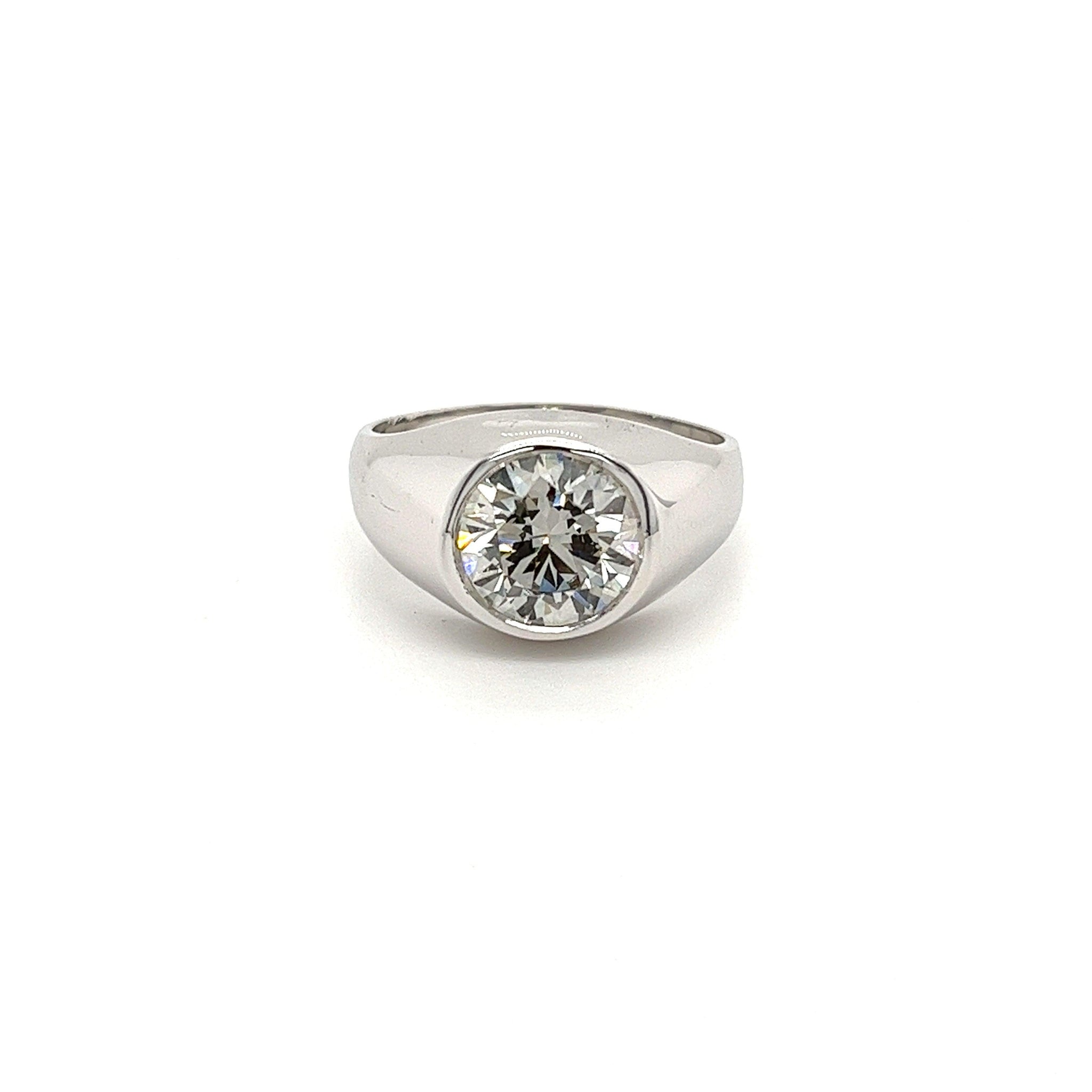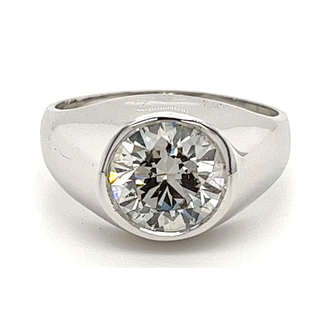 14K white gold bezel set solitaire men's ring mounts a 2.67-carat round cut EGL certified lab-grown diamond.