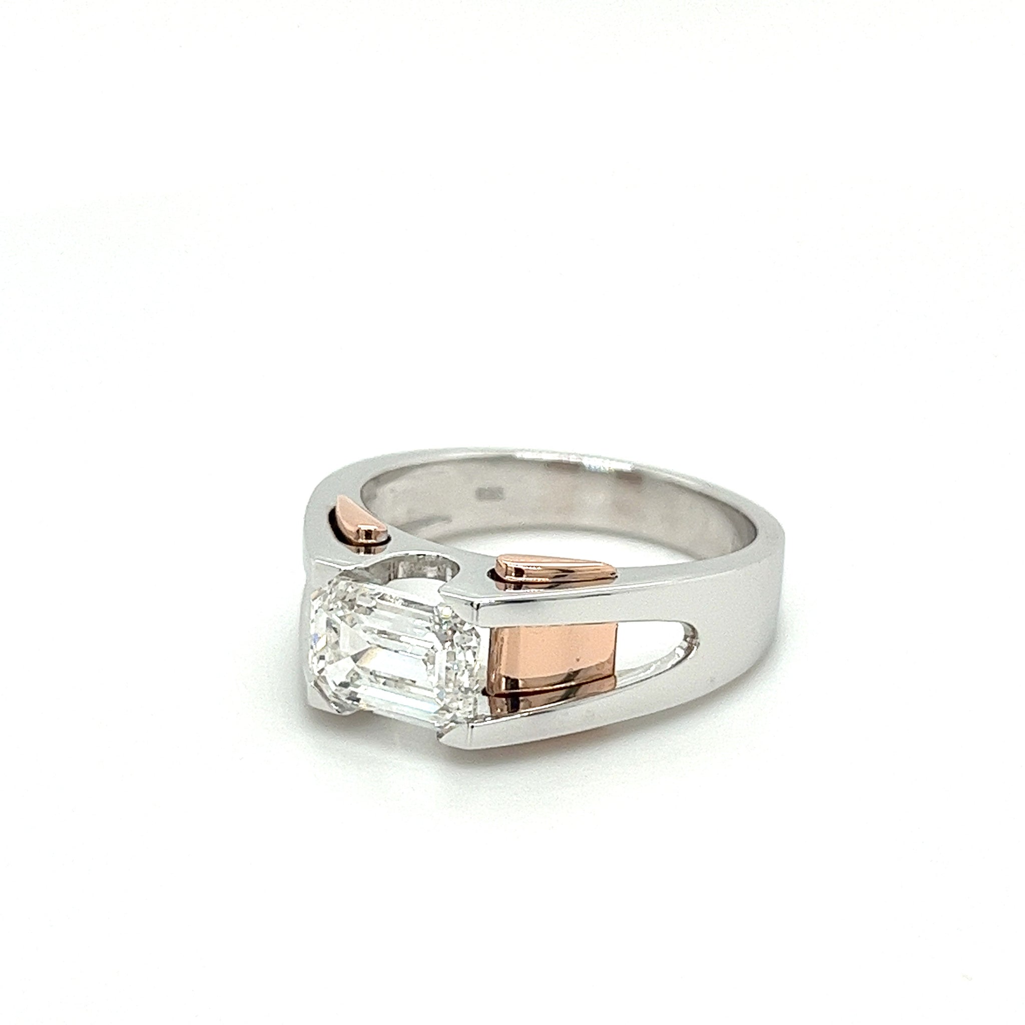 2.87 carat, Emerald cut, G-H color, VVS2-VS1 clarity lab-grown diamond set in 2-tone rose/pink and white 14k gold.