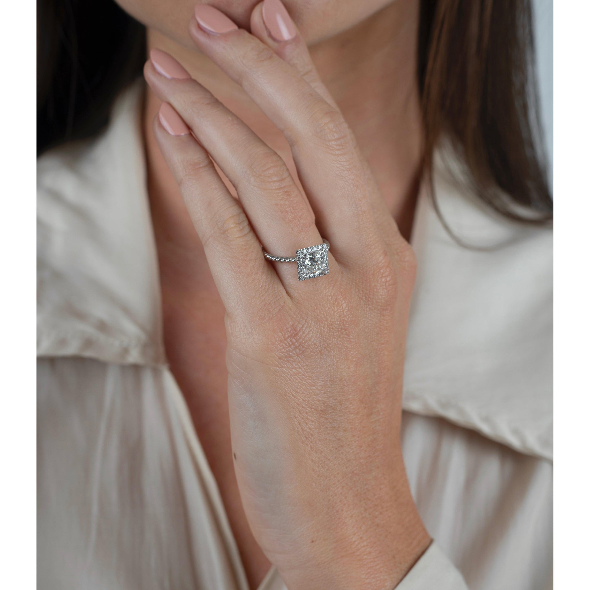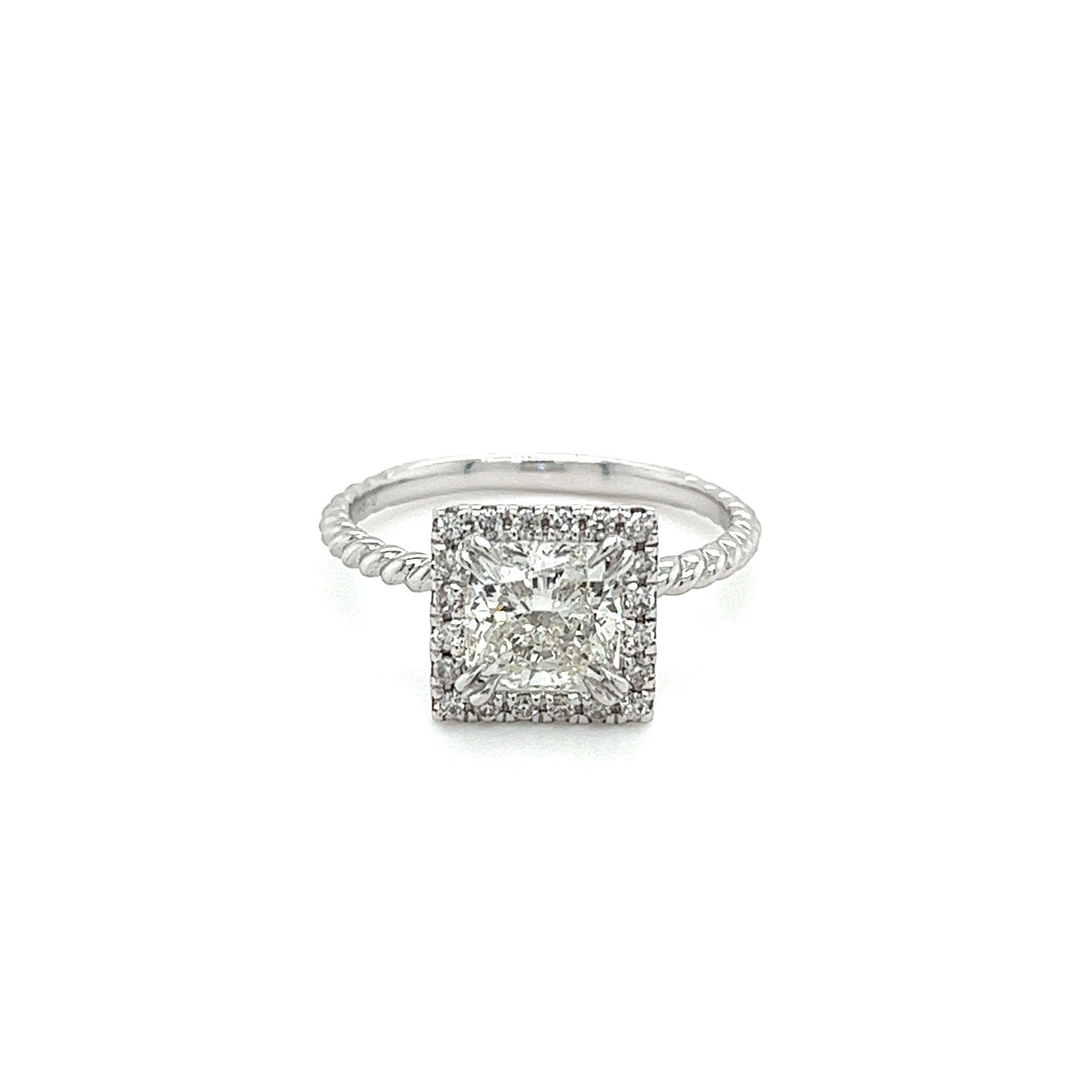 1.60 carat princess cut lab-grown diamond engagement ring with a round cut square-shaped diamond halo. Set in 18k white gold, this captivating engagement ring showcases an artful rope chain design shank, gracefully curved to provide a fascinating contrast to the sharp, symmetrical princess-cut center stone. With its sophisticated allure and exceptional craftsmanship, this ring is an unforgettable symbol of love and commitment, poised to captivate hearts for generations.