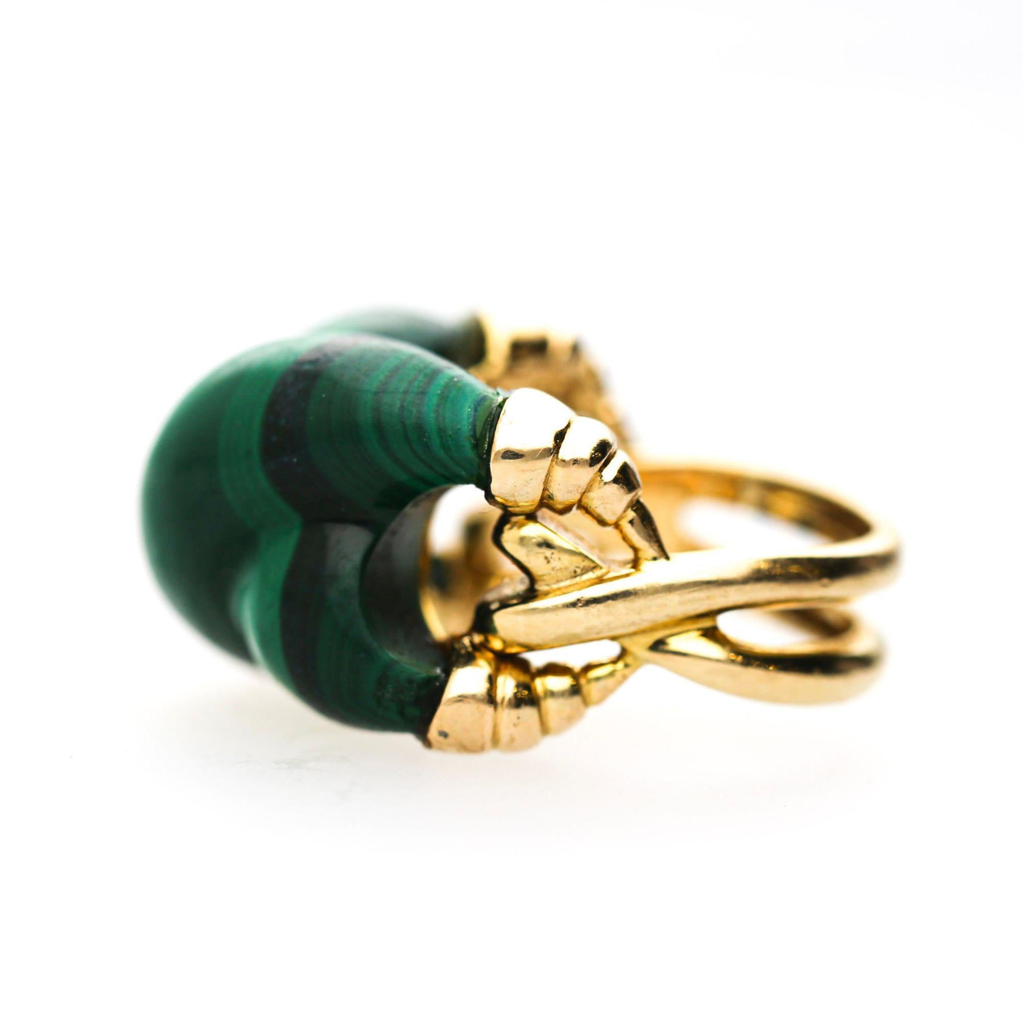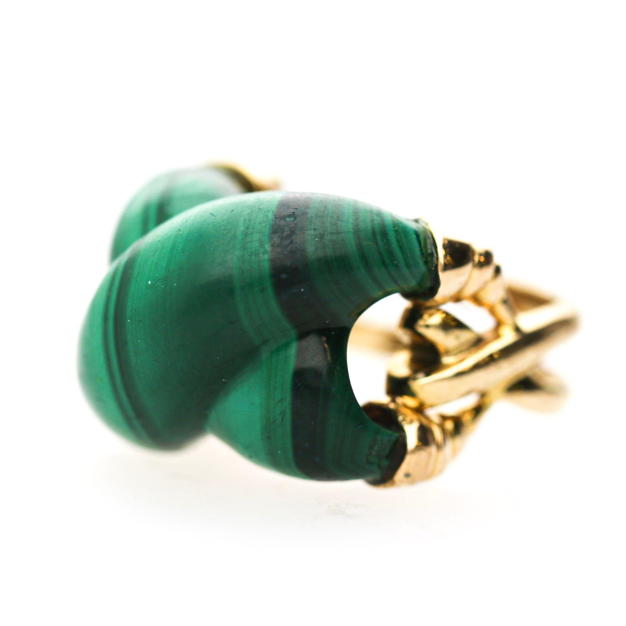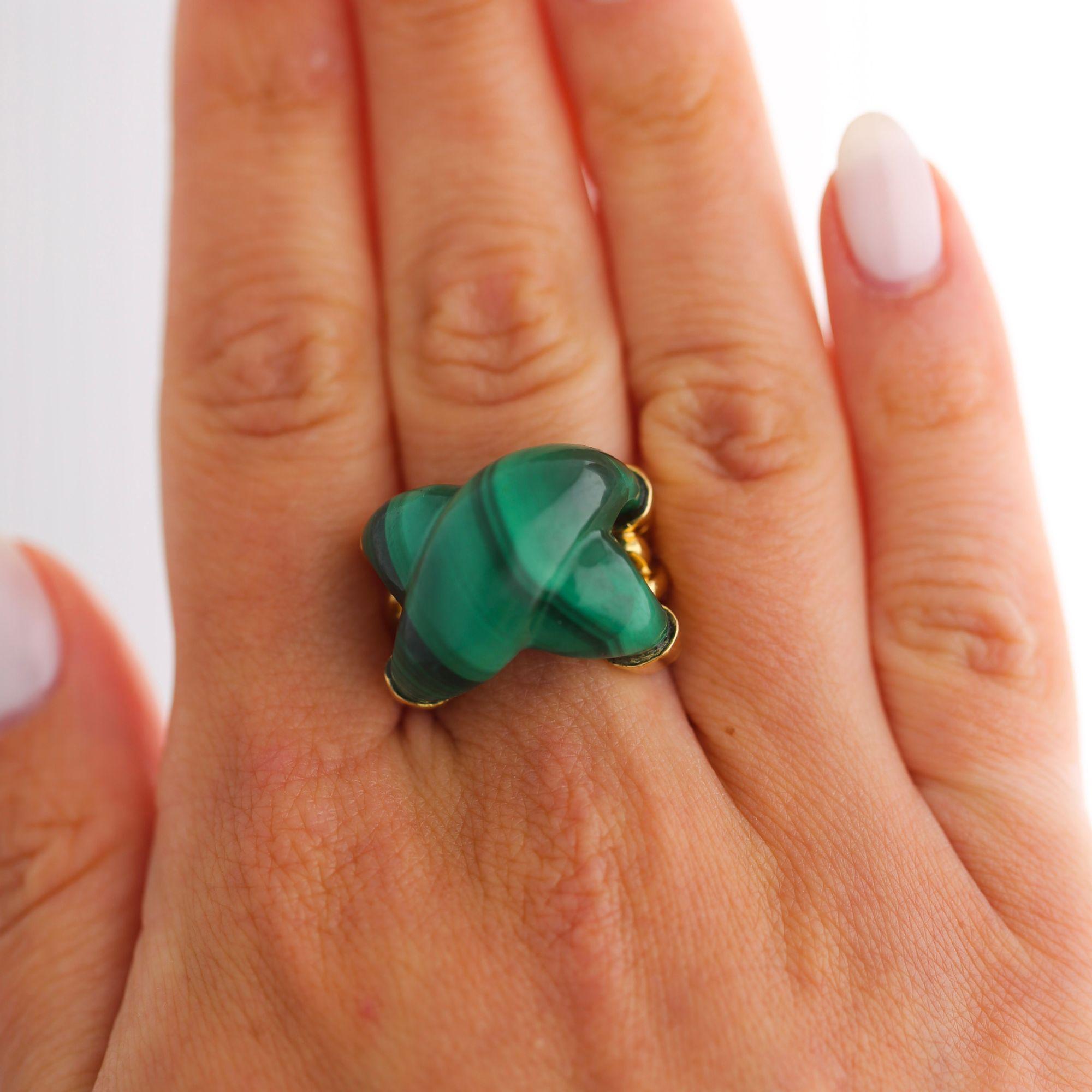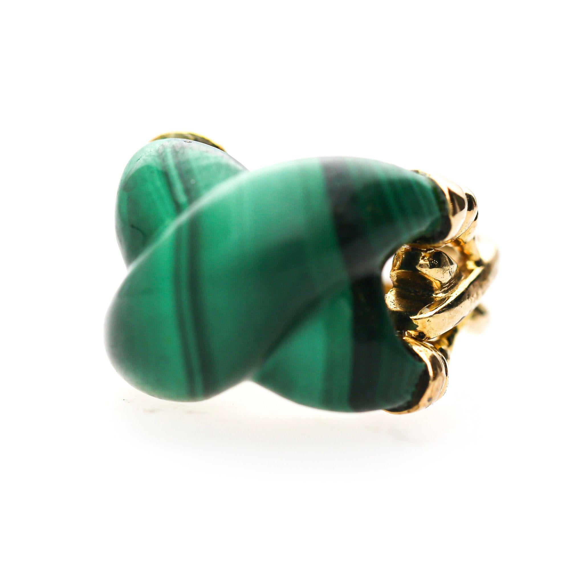This natural malachite has been expertly carved into a four-lobe quatrefoil dome — an organic, floral silhouette that gives the ring its sculptural, three-dimensional character unlike any standard cabochon or faceted stone. Malachite is prized for its vivid, banded green color — alternating bands of deep forest green and bright emerald that are unique to each stone and impossible to replicate. The high-polish dome surface maximizes the visual depth of the banding, creating a rich, swirling green pattern that draws the eye from every direction. This piece is a true collector's statement, combining fine goldsmithing with the natural artistry of carved malachite in a form that is as wearable as it is sculptural.