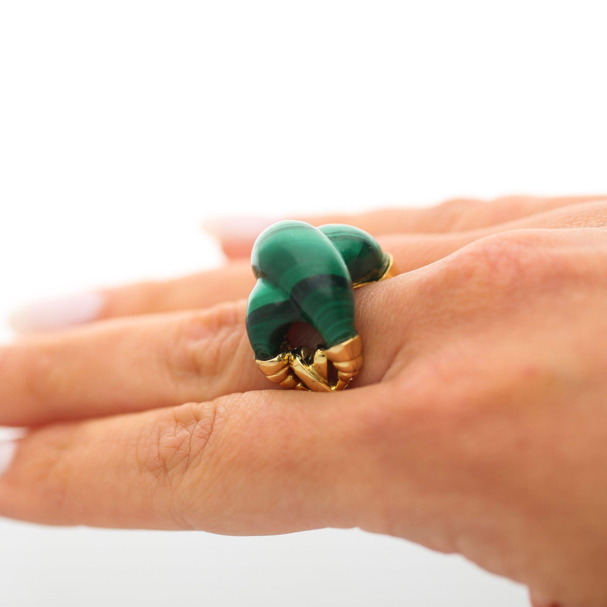 A large sculptural natural malachite carved into a bold quatrefoil four-lobe floral dome form, set in a four-prong 14K yellow gold mounting as a striking cocktail statement ring.