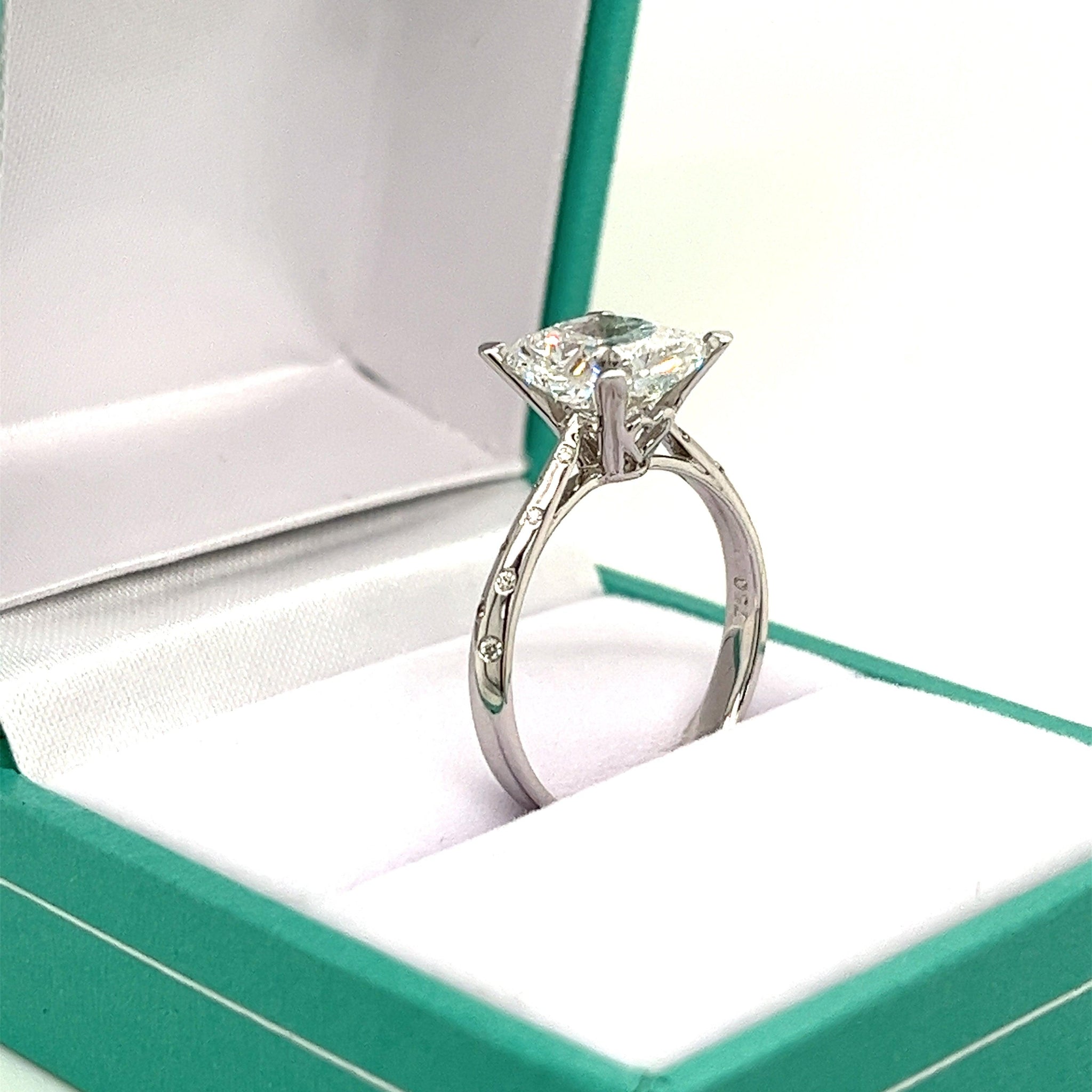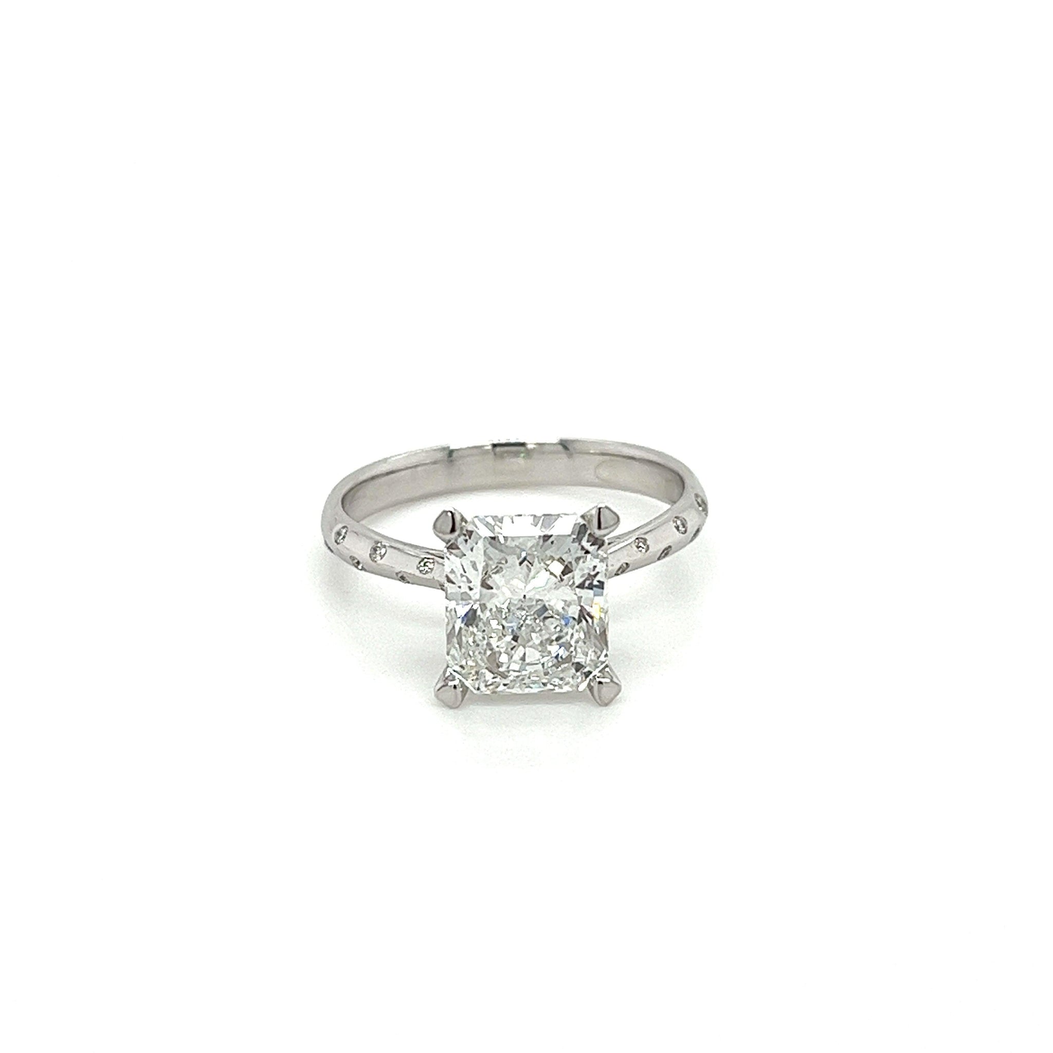 2,82 Karat, E Farbe, VS1 Reinheit, Radiant-Schliff im Labor gezüchteter CVD-Diamant. Eingefasst in einen 18 Karat Weißgold-Kathedrale-Schaft 4-Krappen-Ring. Dieser Ring hat einzigartige Merkmale, die ihn von den typischen Standard-Solitärringen abheben. Mit einer herzförmigen Kathedrale, 14 natürlichen schwebenden Diamonds auf dem Schaft und einem verjüngten Ende des Schafts, das den Mittelstein größer erscheinen lässt.