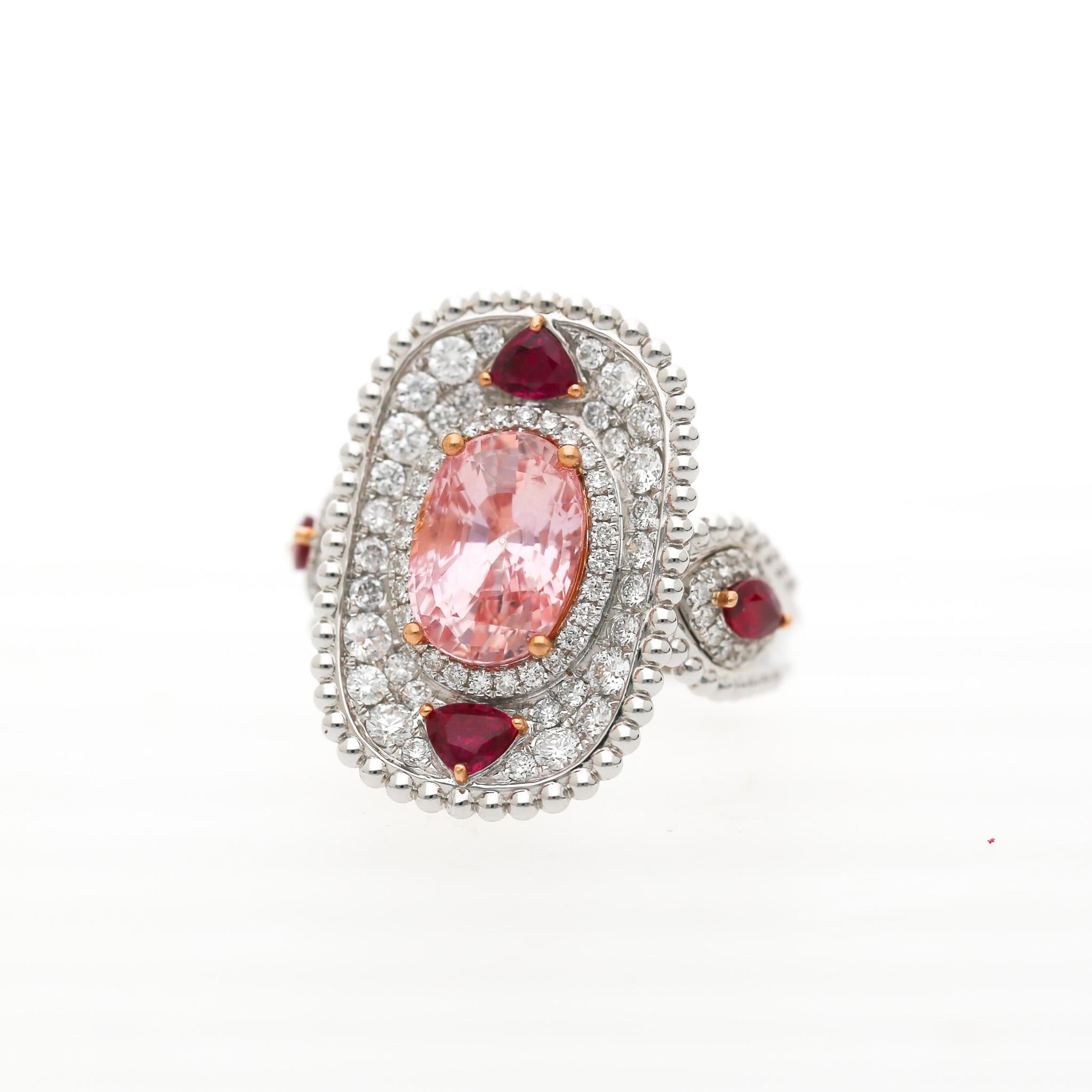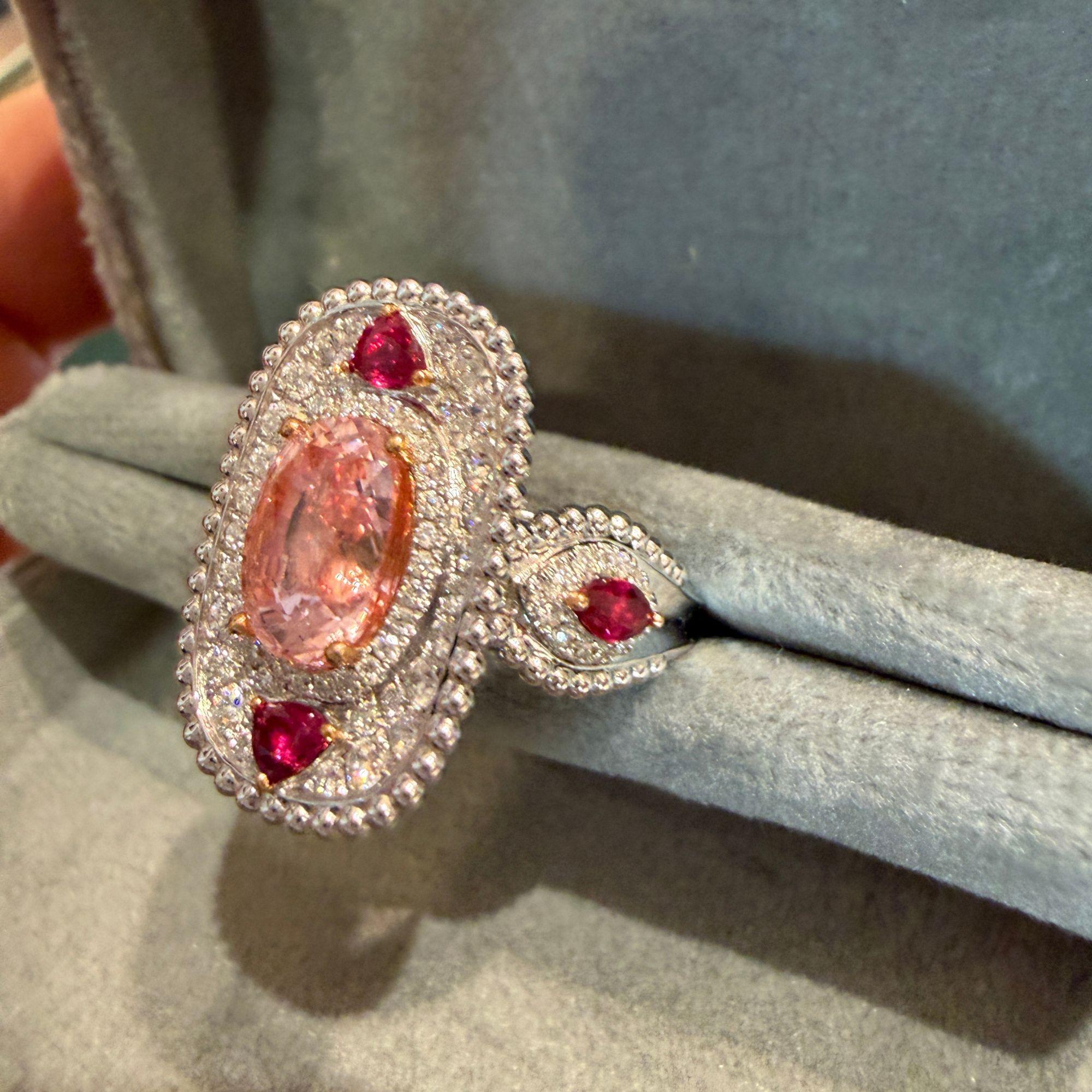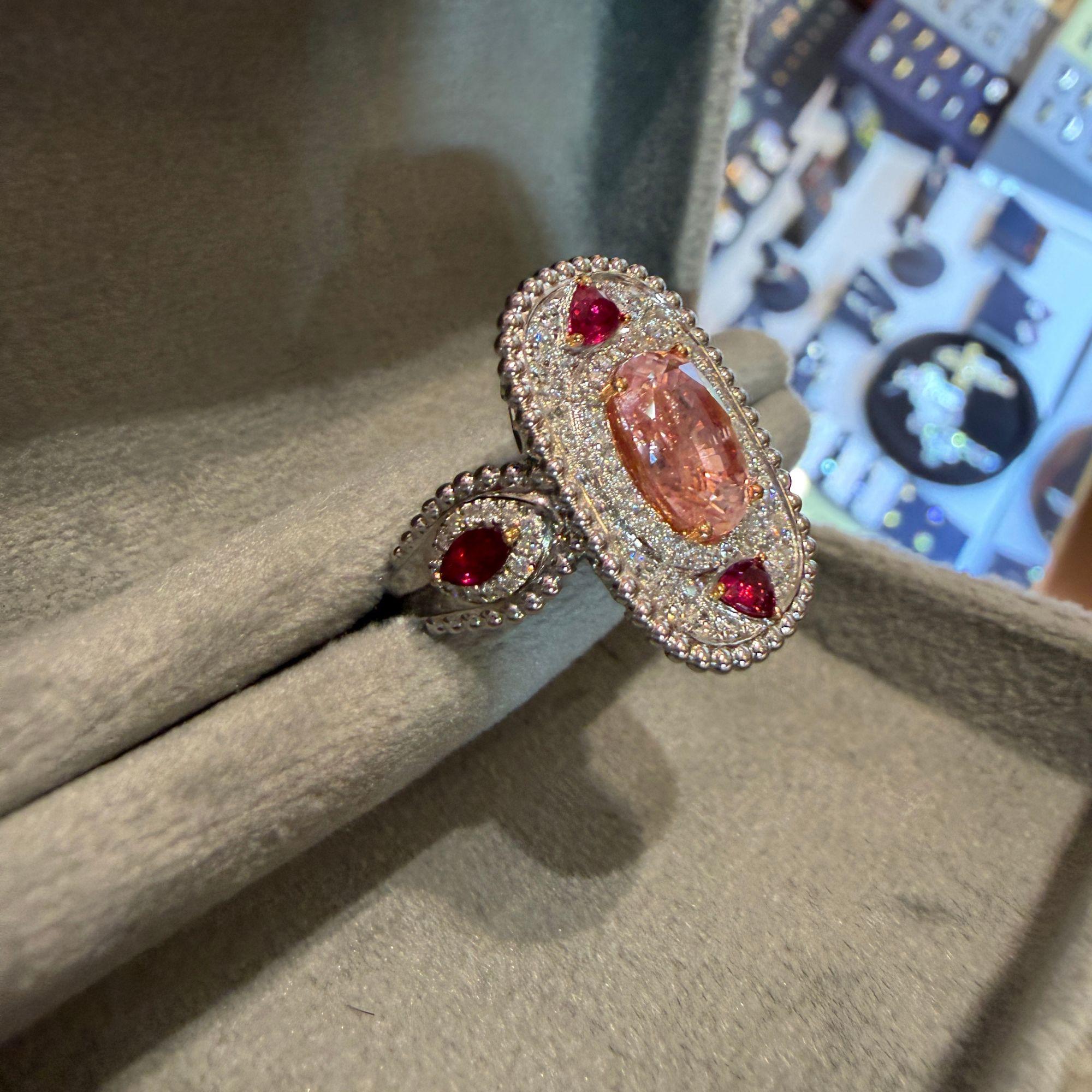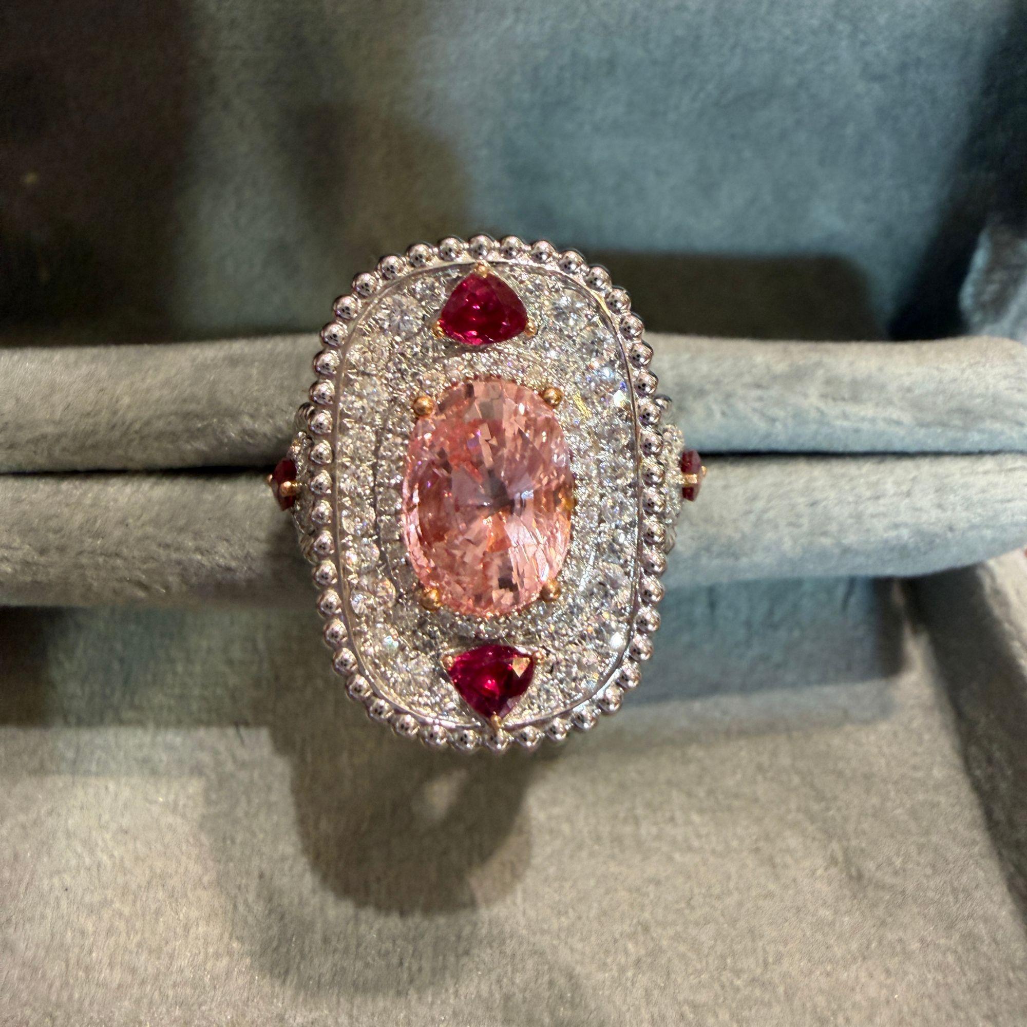 4.05 Carat Padparadscha Sapphire No Heat Sri Lanka With Ruby and Diamond Ring