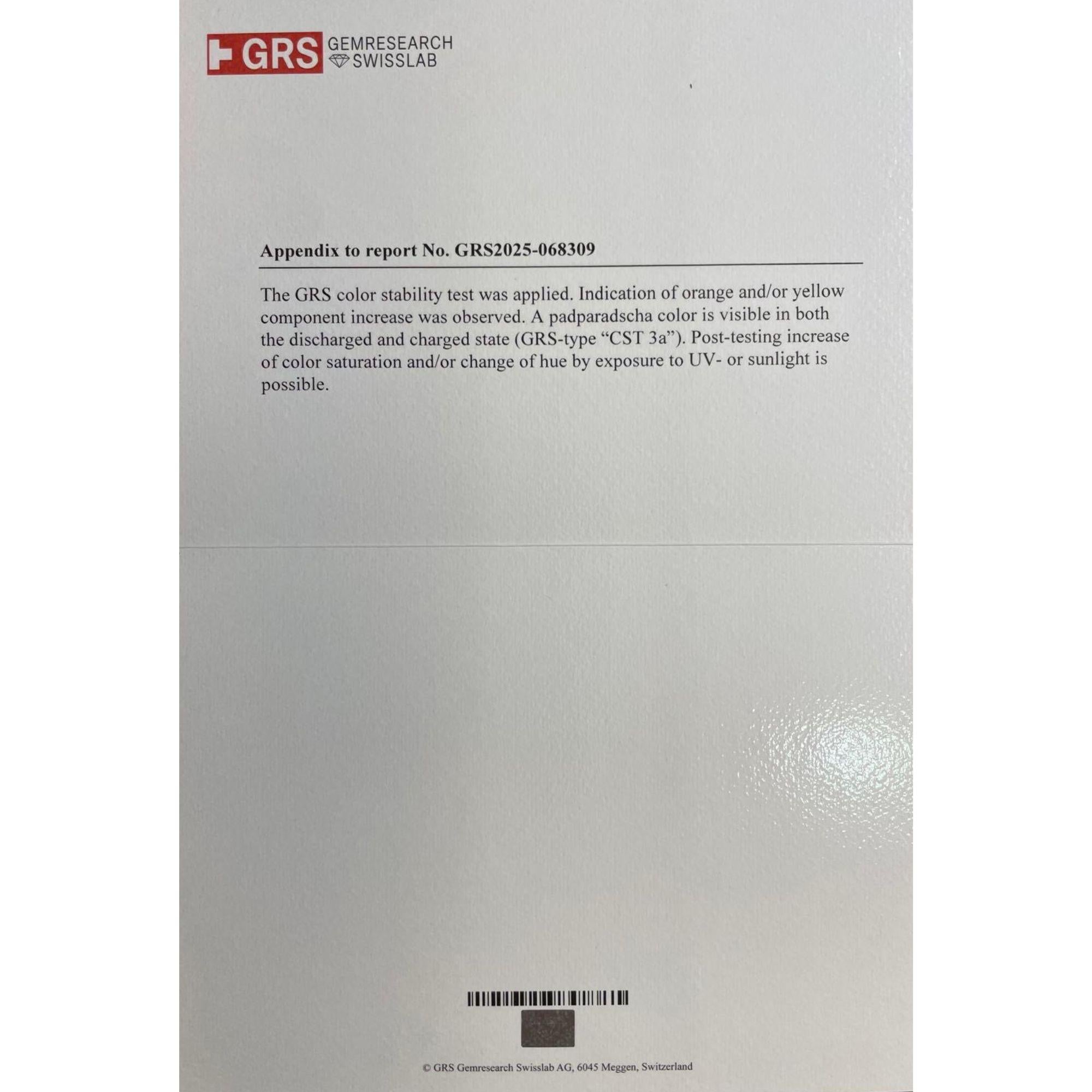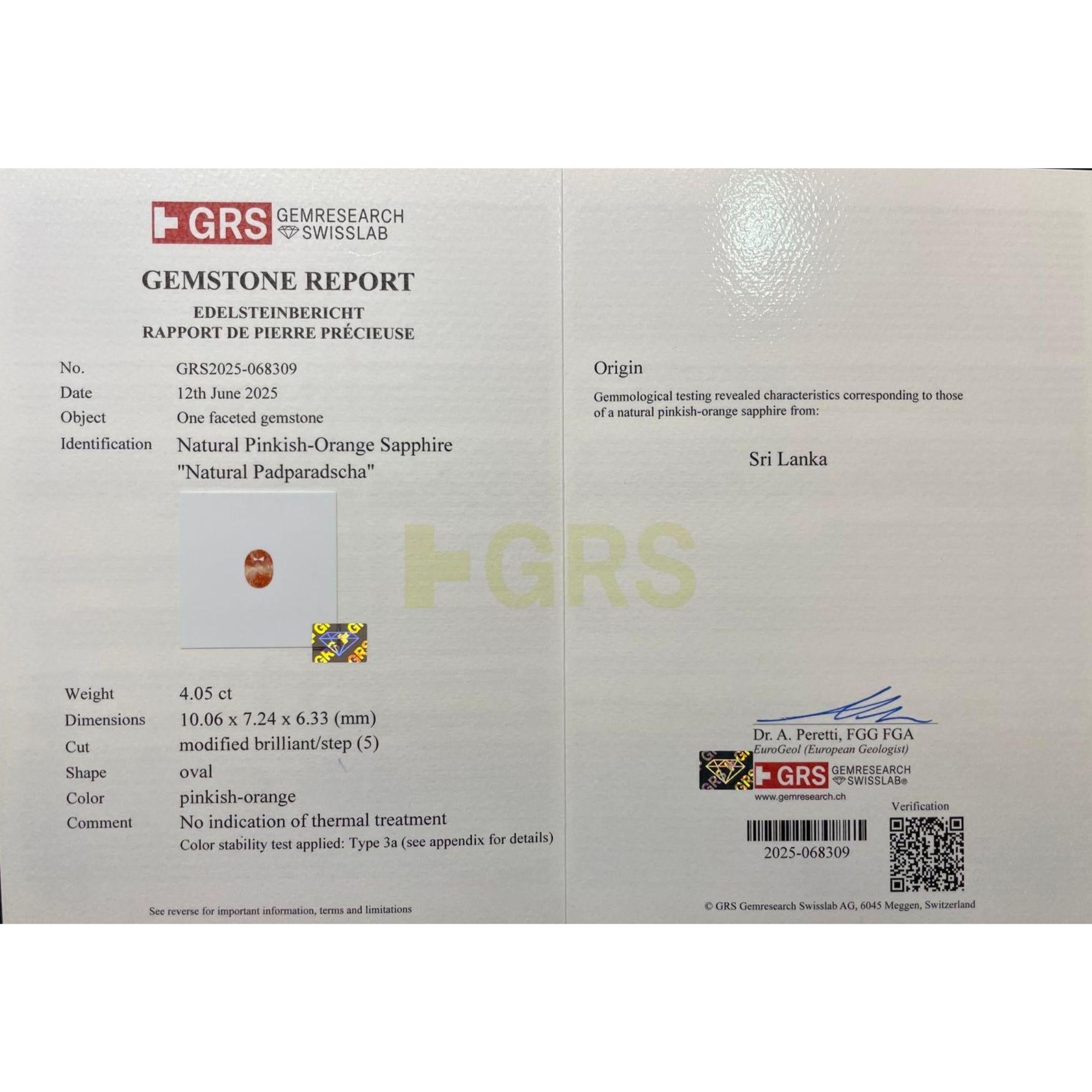 The 4.05 carat padparadscha sapphire is among the rarest and most coveted varieties of colored gemstone in the world — a certified unheated stone from Sri Lanka displaying the prized pinkish-orange hue that places it in an elite category above standard pink or orange sapphires. GRS Labs, one of the world's foremost gem laboratories, has confirmed both the padparadscha color classification and the absence of any thermal treatment, a distinction that dramatically elevates the stone's rarity and value. Featuring the classic warm peachy pink of the padparadscha, this is an exceptionally rare and true collector-level acquisition.