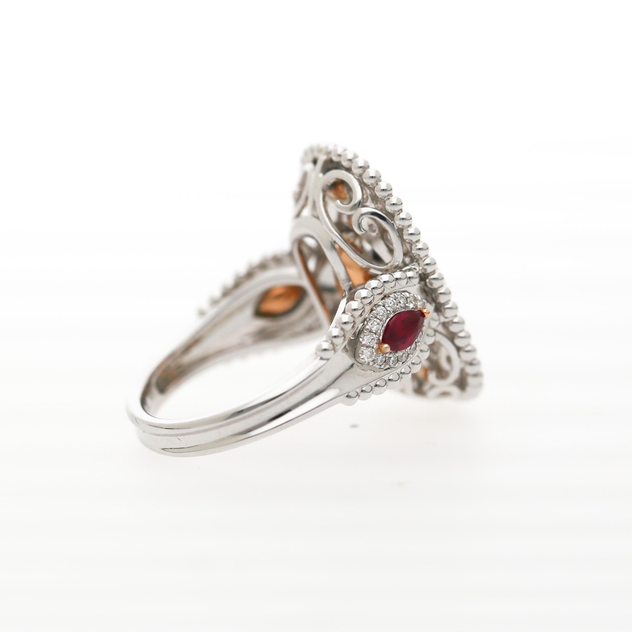 The setting is an elaborate shield-shaped 18K white gold mounting with a beaded milgrain border that frames the entire face, evoking an antique medallion aesthetic. A double row of pavé-set round brilliant diamonds encircles the center stone in a glowing halo, while four trillion and round rubies set in yellow gold prongs punctuate the composition at the cardinal points for a vivid color contrast. The gallery features an open filigree scrollwork construction that is as breathtaking from the side and back as it is from the top.
