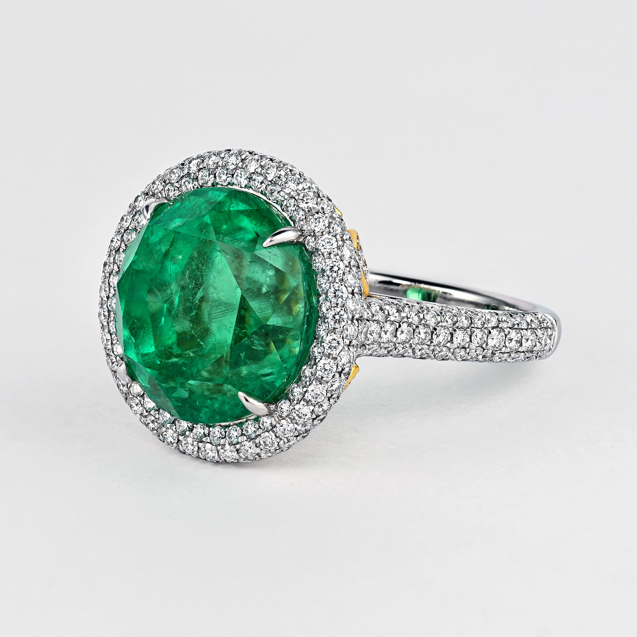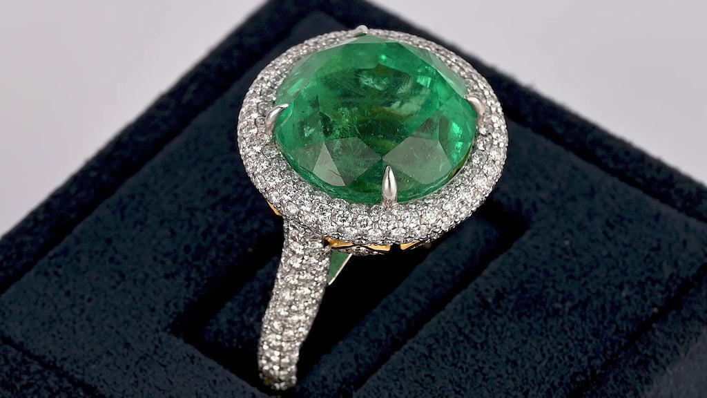 Unser bemerkenswerter 15,49-karätiger runder natürlicher Smaragd ist bedeutend aufgrund seiner Kombination aus beeindruckender Größe, lebhaftem Grünton, schwacher Ölanwendung und dem vollendeten runden Schliff. Die Seltenheit eines runden Schliffs, kombiniert mit der atemberaubenden Qualität dieses Steins, macht ihn zu einem außergewöhnlichen Stück feiner Schmuckkunst, das Lob und Wertschätzung verdient.