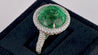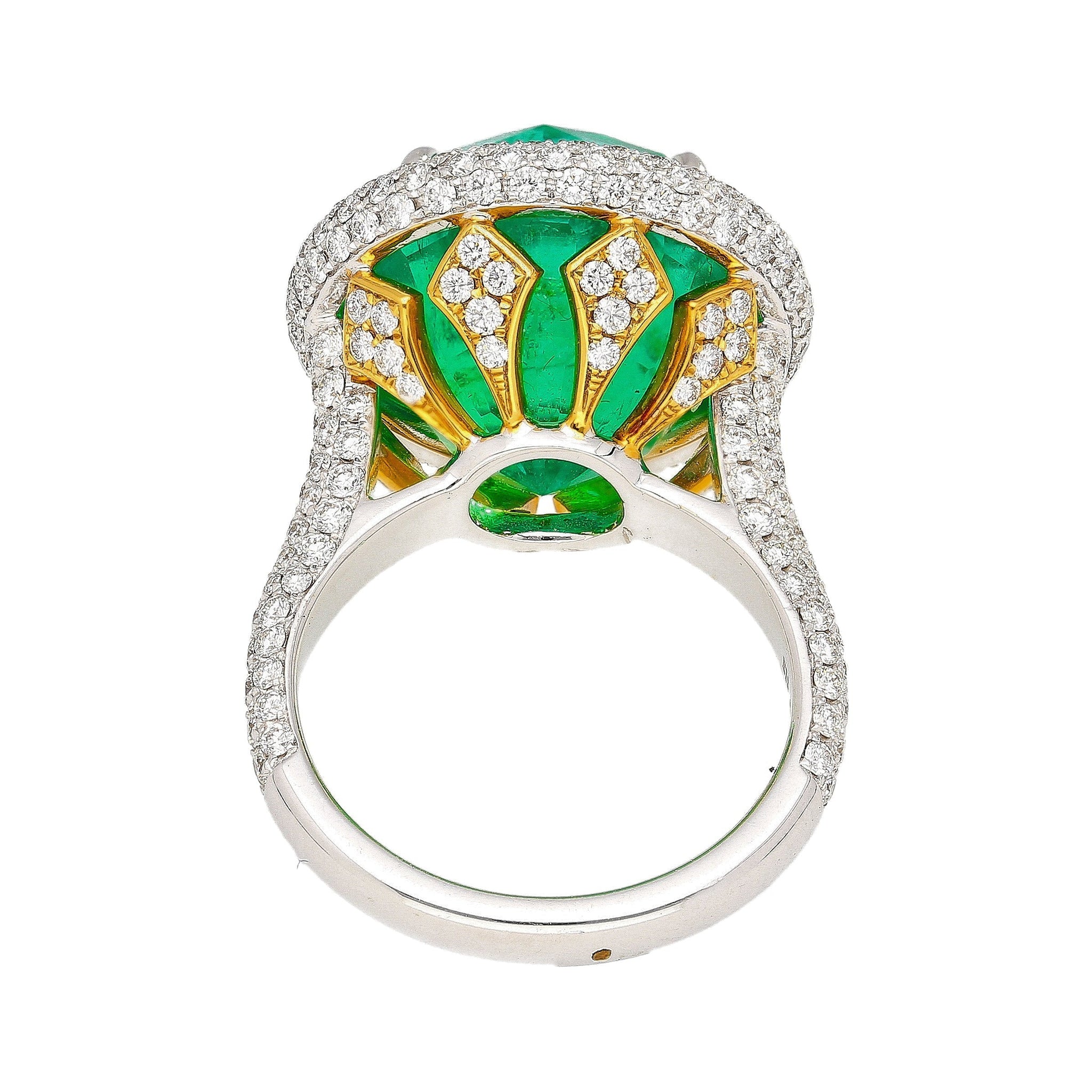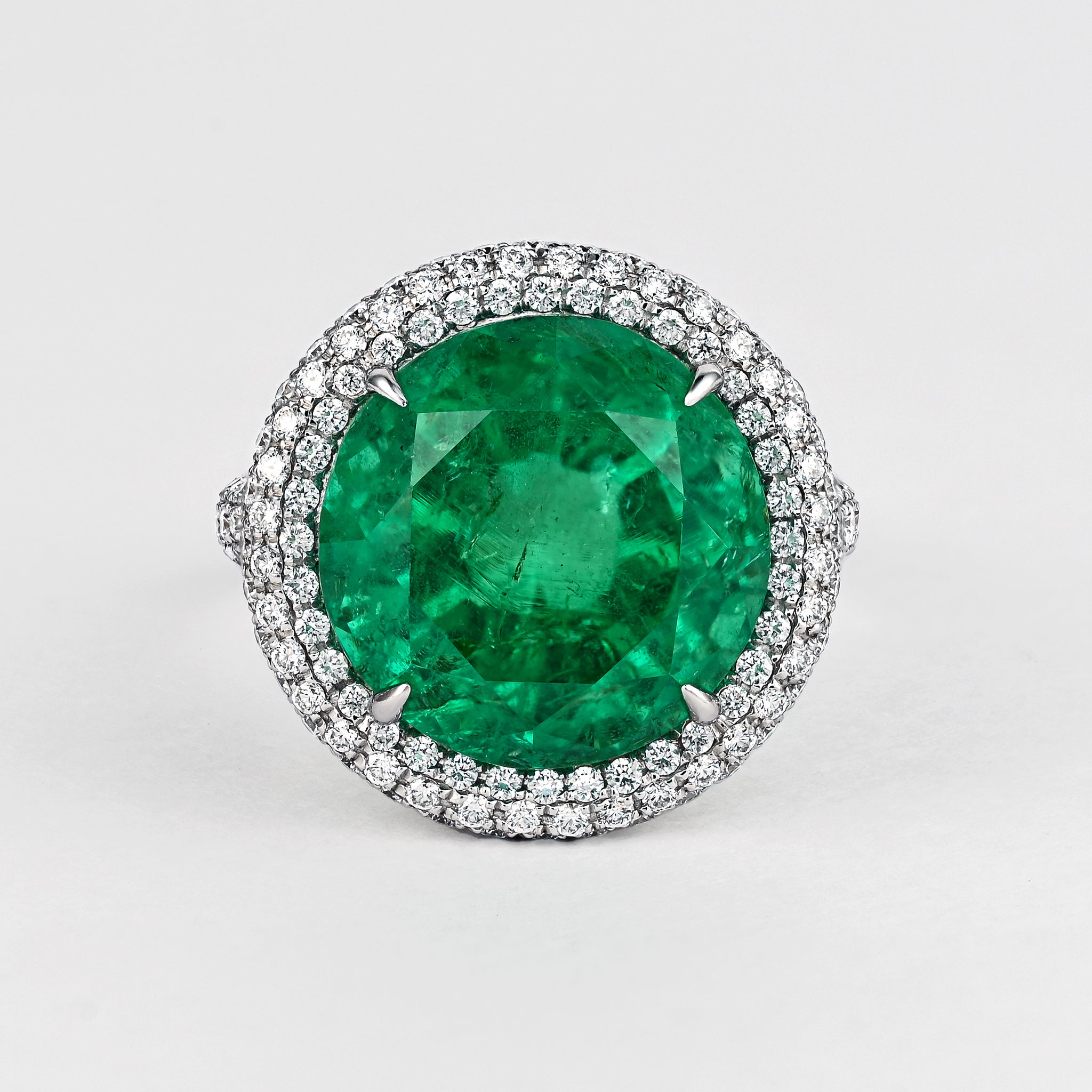 Dieser prächtige kolumbianische Smaragd- und Diamant-Ring verfügt über einen 15,49 Karat runden Schliff Faint Oil kolumbianischen Smaragd in der Mitte und wird von einem American Gemological Laboratory (AGL) Zertifikat begleitet.