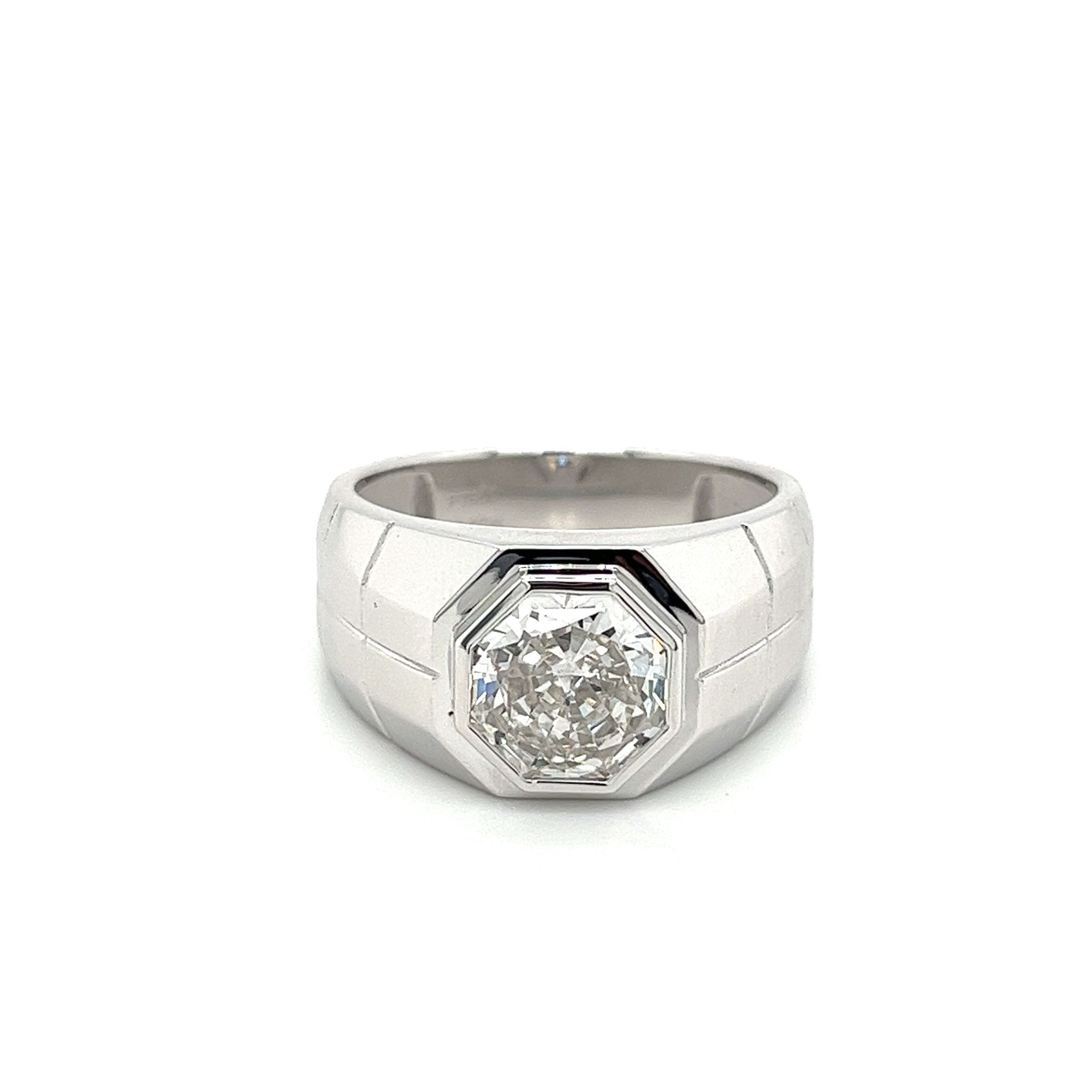 Erhöhen Sie Ihren Stil mit unserem 3-Karat-Labor-Diamant im Achteckschliff Herrenring, der eine Zargenfassung und einen strukturierten Linien-Ring-Schaft in Platin aufweist. Dieser exquisite Ring besticht durch ein schickes und scharfes Design, das ein unvergleichliches Maß an Eleganz ausstrahlt. Mit seinen einzigartigen und verführerischen Merkmalen ist es ein Stück, das sicher die Aufmerksamkeit aller auf sich zieht, die es erblicken. Kaufen Sie jetzt und genießen Sie die außergewöhnliche Qualität unseres hochwertigen Labor-Diamanten, der in einem raffinierten und stilvollen Ring gefasst ist, der wirklich einzigartig ist.