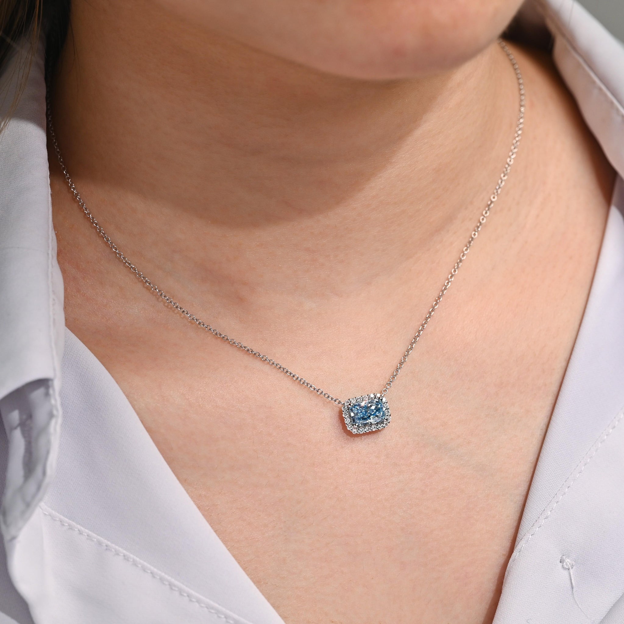 The elegant halo setting showcases the rare blue diamond in a secure four-prong mounting surrounded by brilliant white diamonds. Crafted in 14K white gold, the setting enhances the blue diamond's color while providing exceptional durability. The adjustable cable chain allows for versatile wear at different lengths with a secure lobster clasp closure.