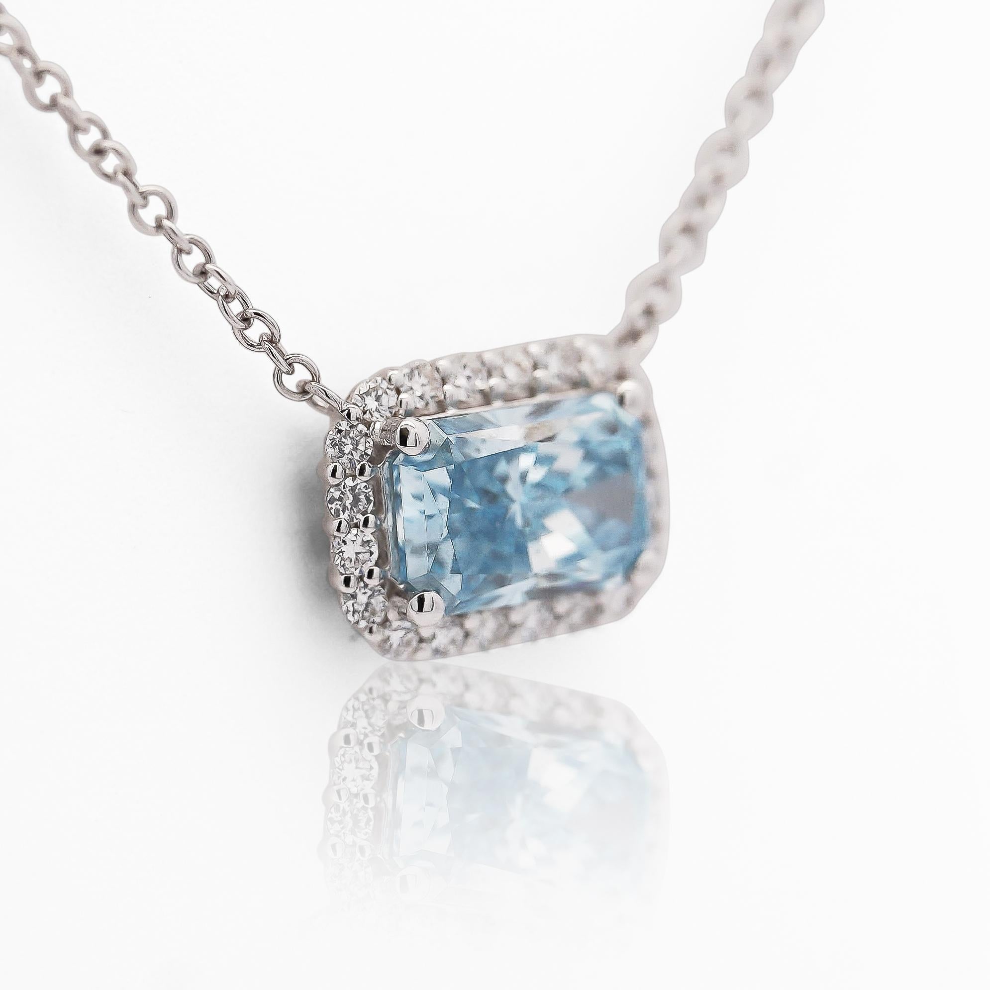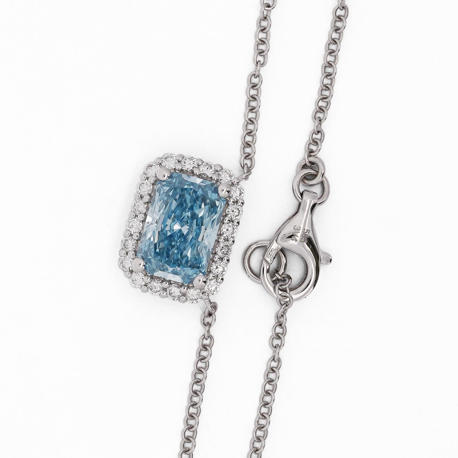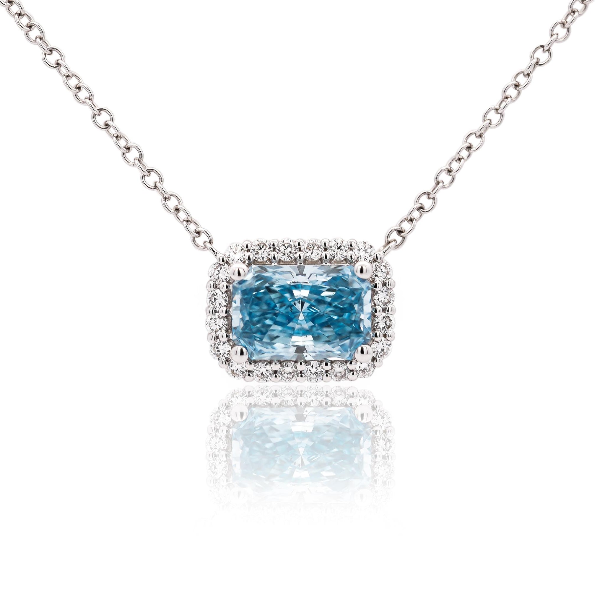 Lab Grown blue diamond pendant necklace in 14K white gold featuring 1.52 carat radiant cut blue diamond surrounded by 0.20 carats of white diamonds. Adjustable cable chain included, weighs 2.41 grams total.