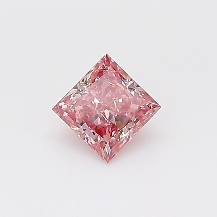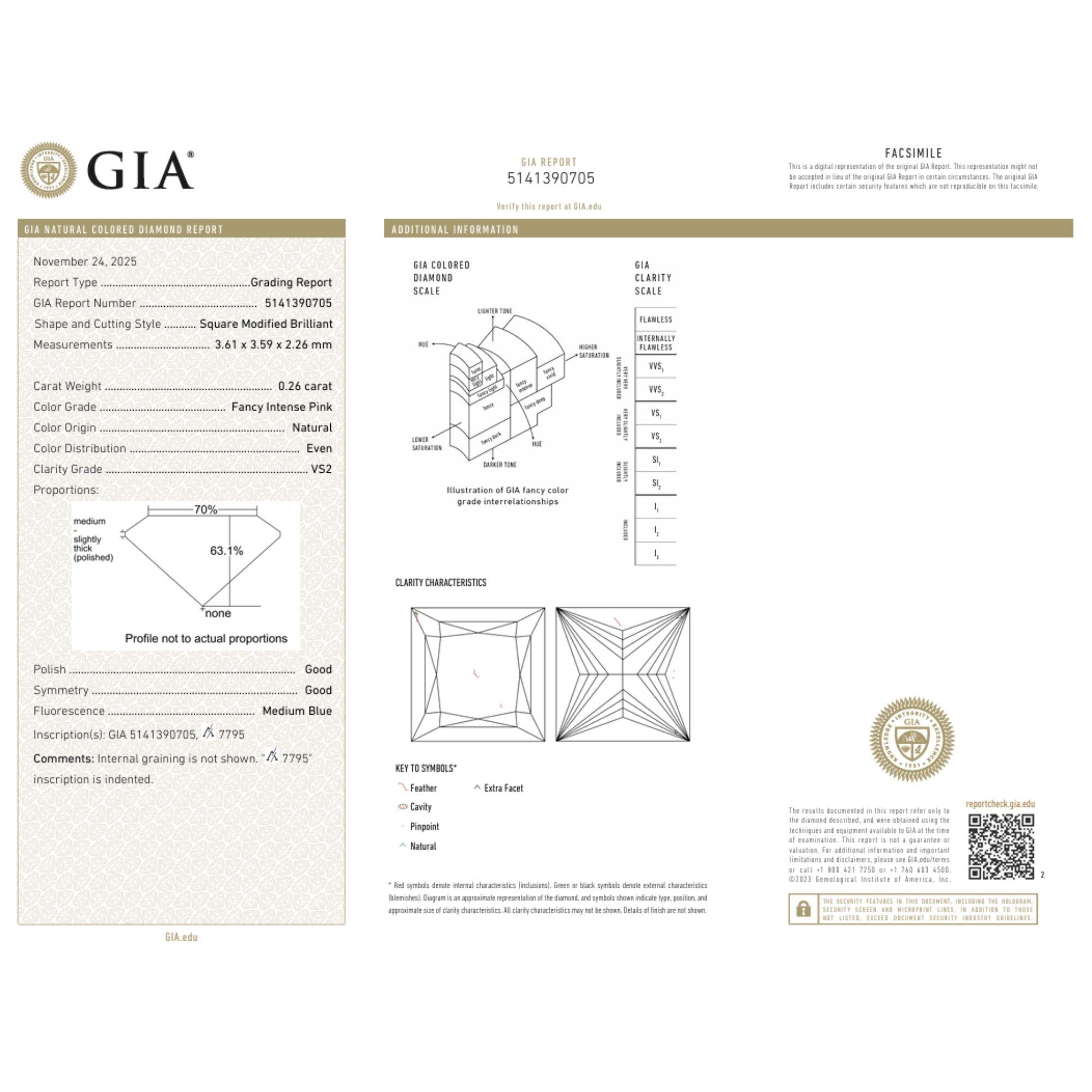 GIA-certified 0.26 carat natural fancy intense Argyle pink diamond in square modified brilliant (princess) cut weighing 0.26 carats with VS2 clarity, measuring 3.61 x 3.59 x 2.26mm. Features even color distribution, good polish and symmetry, with medium blue fluorescence.