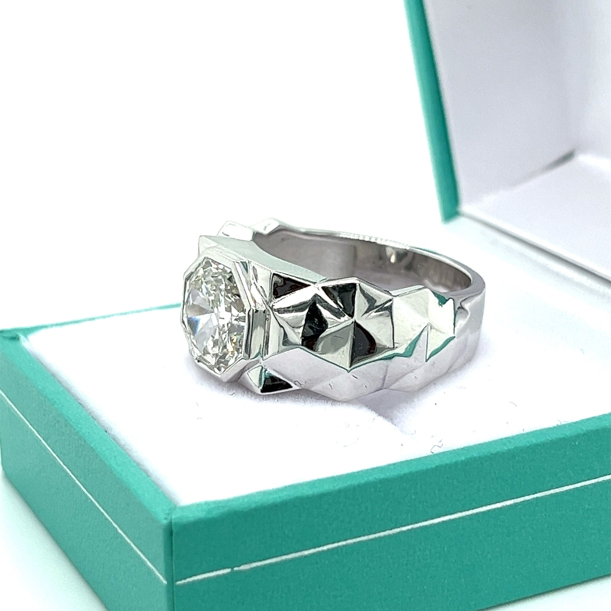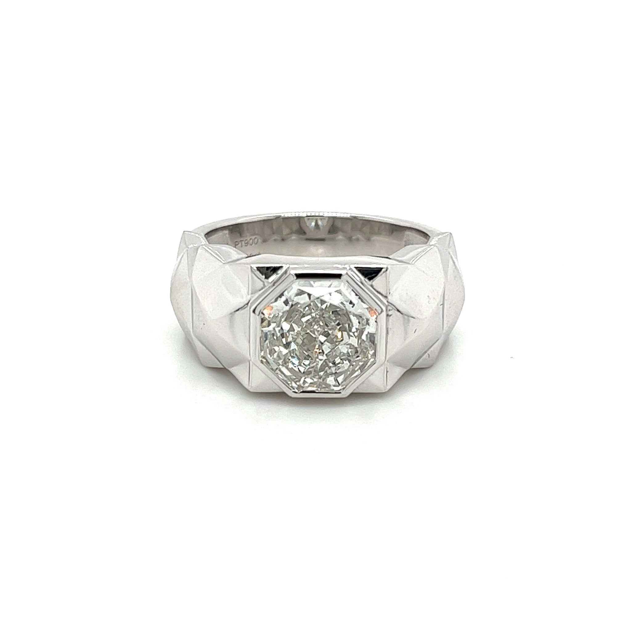 IGI Certified 4,48 carat diamant octogonal taillé en laboratoire CVD serti dans une Bague en platine texturé avec serti clos. Cette Bague en platine texturé pour homme présente une finition rocheuse avec un serti clos net. Un magnifique mariage de symétrie et de contraste. La pierre centrale est pure à l'œil et pleine de vie. Une coupe octogonale inhabituelle avec des facettes vibrantes qui scintillent sous tous les angles. Une Bague pour ceux qui recherchent quelque chose de mieux que l'ordinaire. Une véritable pièce de déclaration.