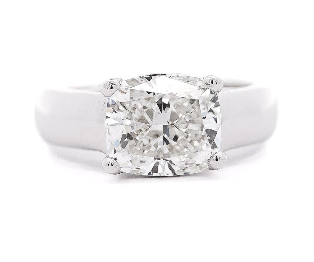 Bague Solitaire Est-Ouest avec Coussin en diamant de laboratoire CVD de 3,46 carats certifié IGI. Cette bague est fabriquée en or blanc 14k, pèse 7,1 grammes et est sertie à 4 griffes. La bague est en taille US 6 et sa largeur est de 4,8 mm.