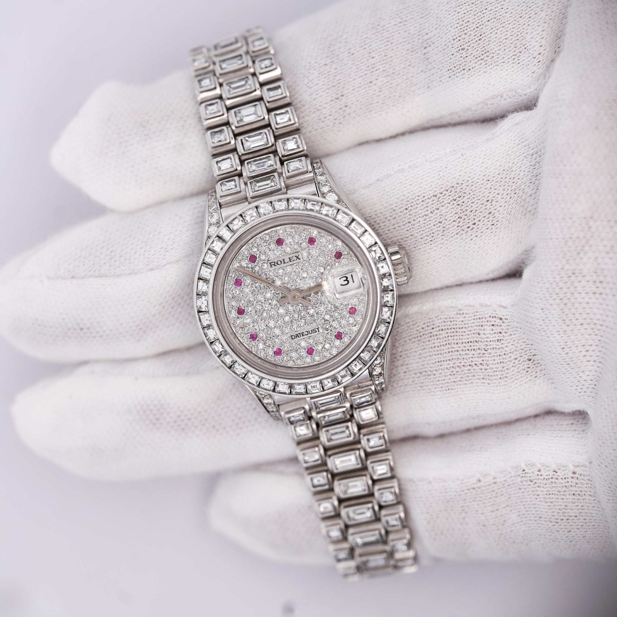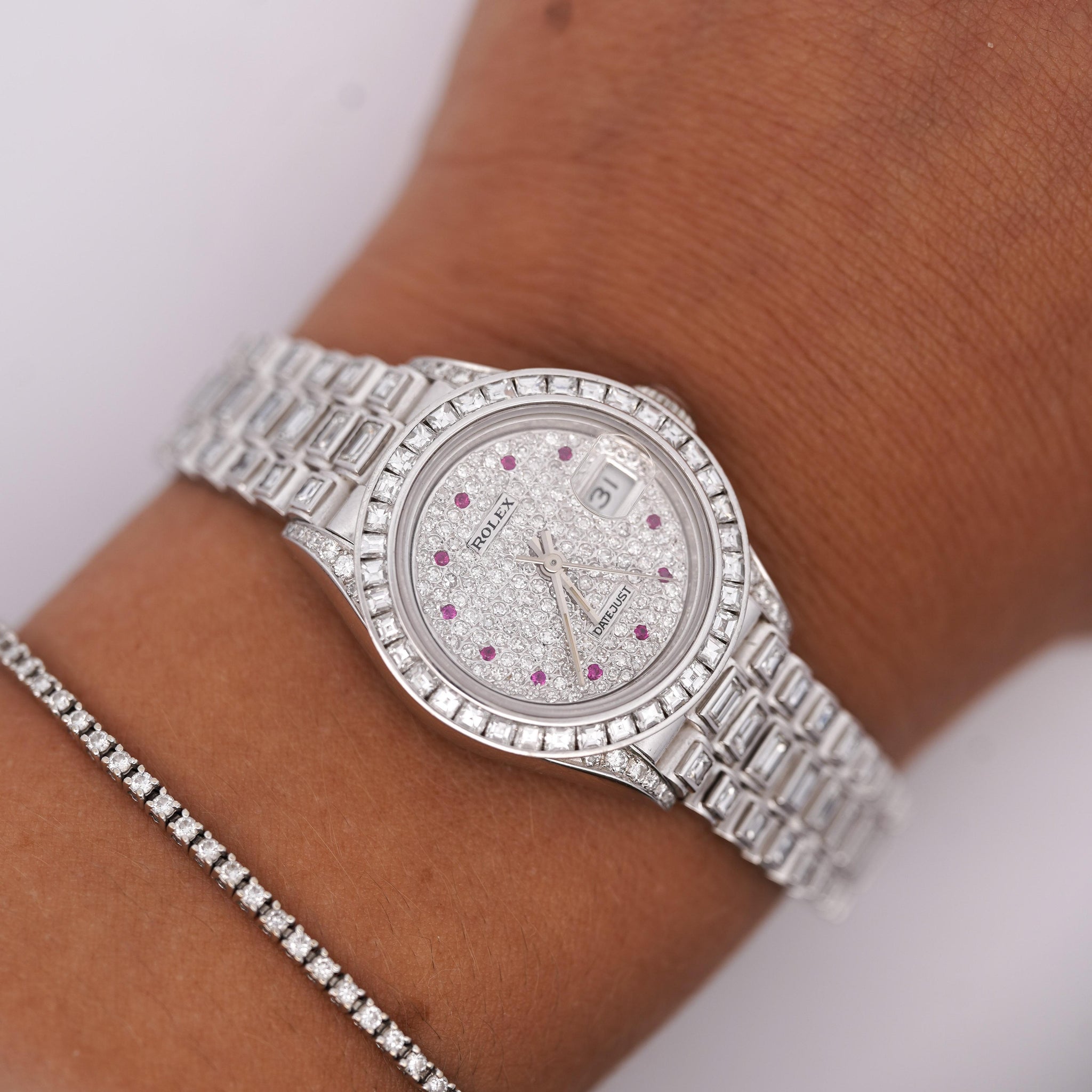 Add a sparkle to your style with the Rolex Platinum DateJust Presidential watch. Featuring a stunning 15 carats of diamonds and a sleek 26mm platinum case, this timepiece blends luxury with fun sophistication. Perfect for those who love to shine bright and keep time in style!