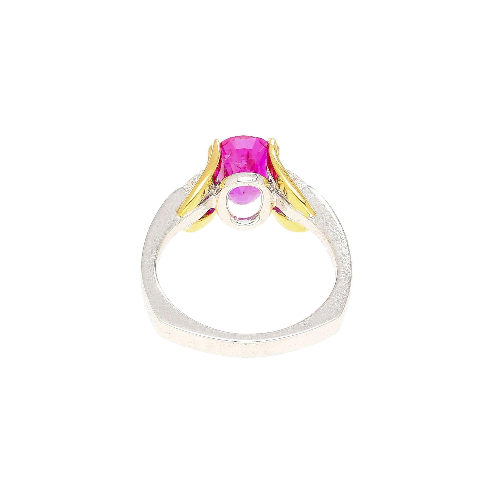 GIA-certified 2.42 carat cushion-cut purplish pink sapphire from Vietnam in an 18K two-tone gold and platinum three-stone setting with trillion-cut diamond side stones. Platinum and yellow gold construction with sculptural shoulders. Ring size 6, adjustable.