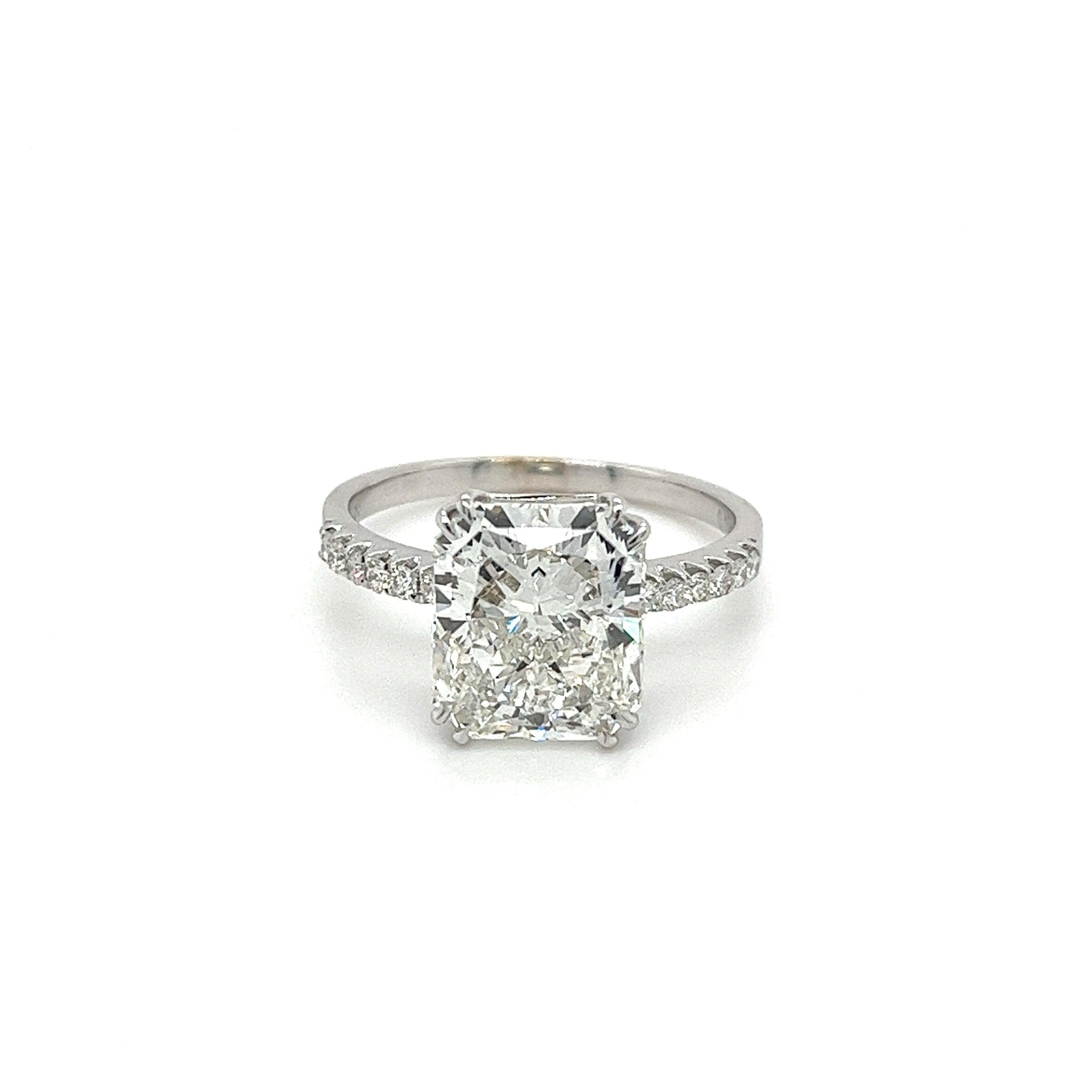Extravagant and luxurious, this radiant cut lab-grown diamond features a slightly elongated cut that's exploding with brilliance and sparkle. Set in a beautiful 18-karat white gold basket style ring mounting with natural round cut diamond side stones.