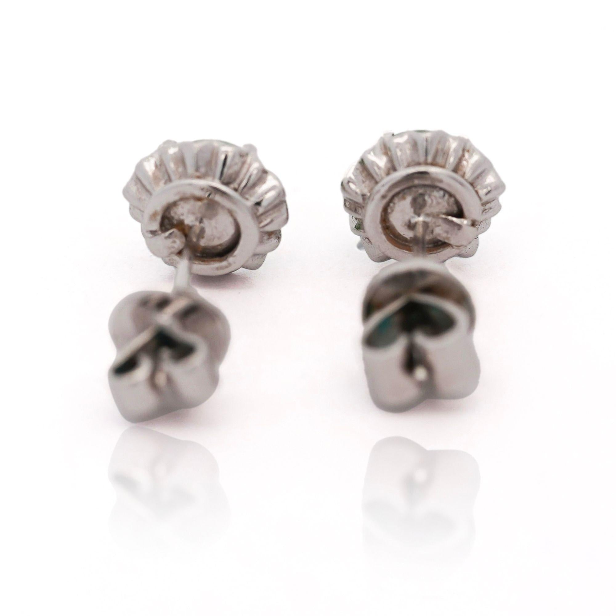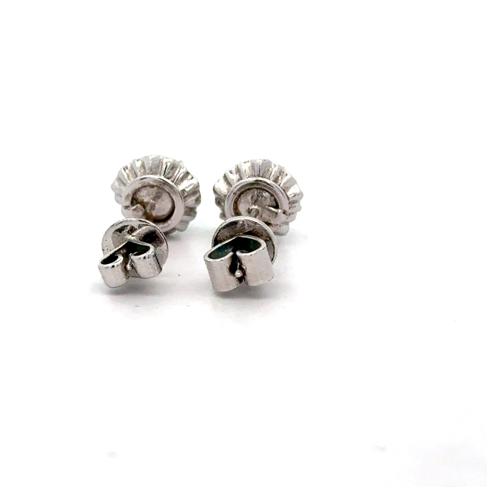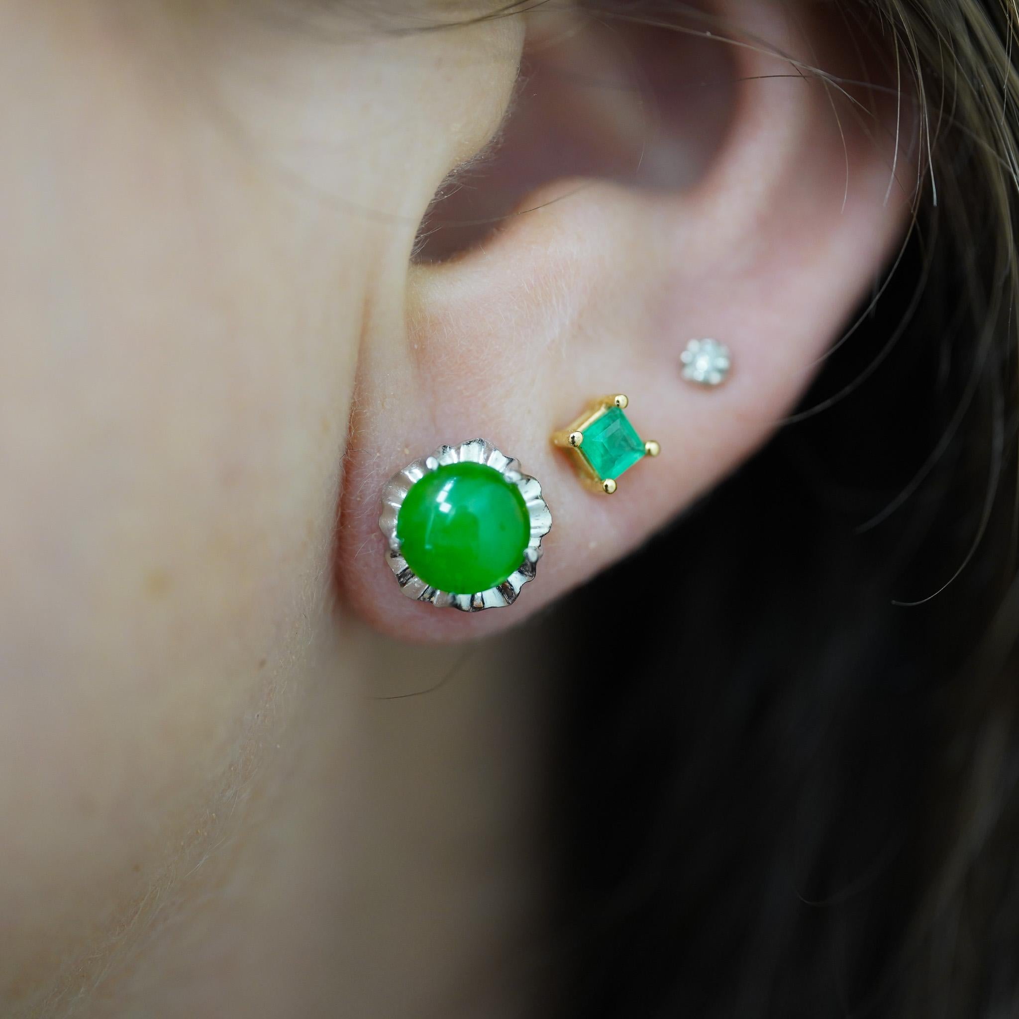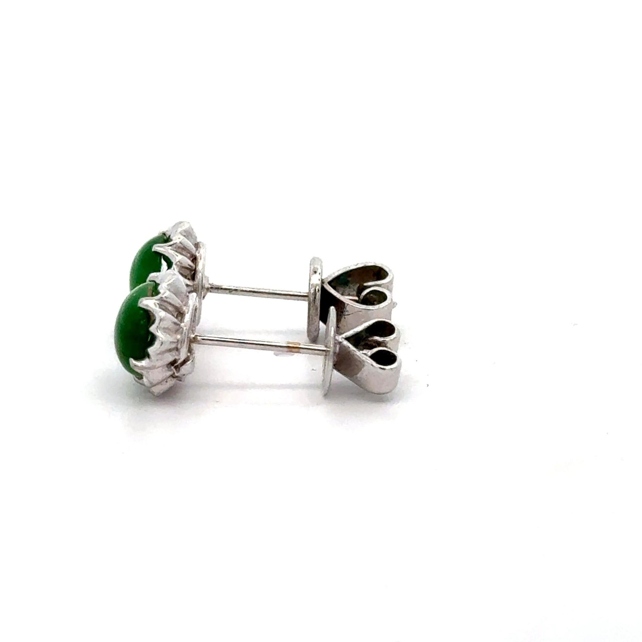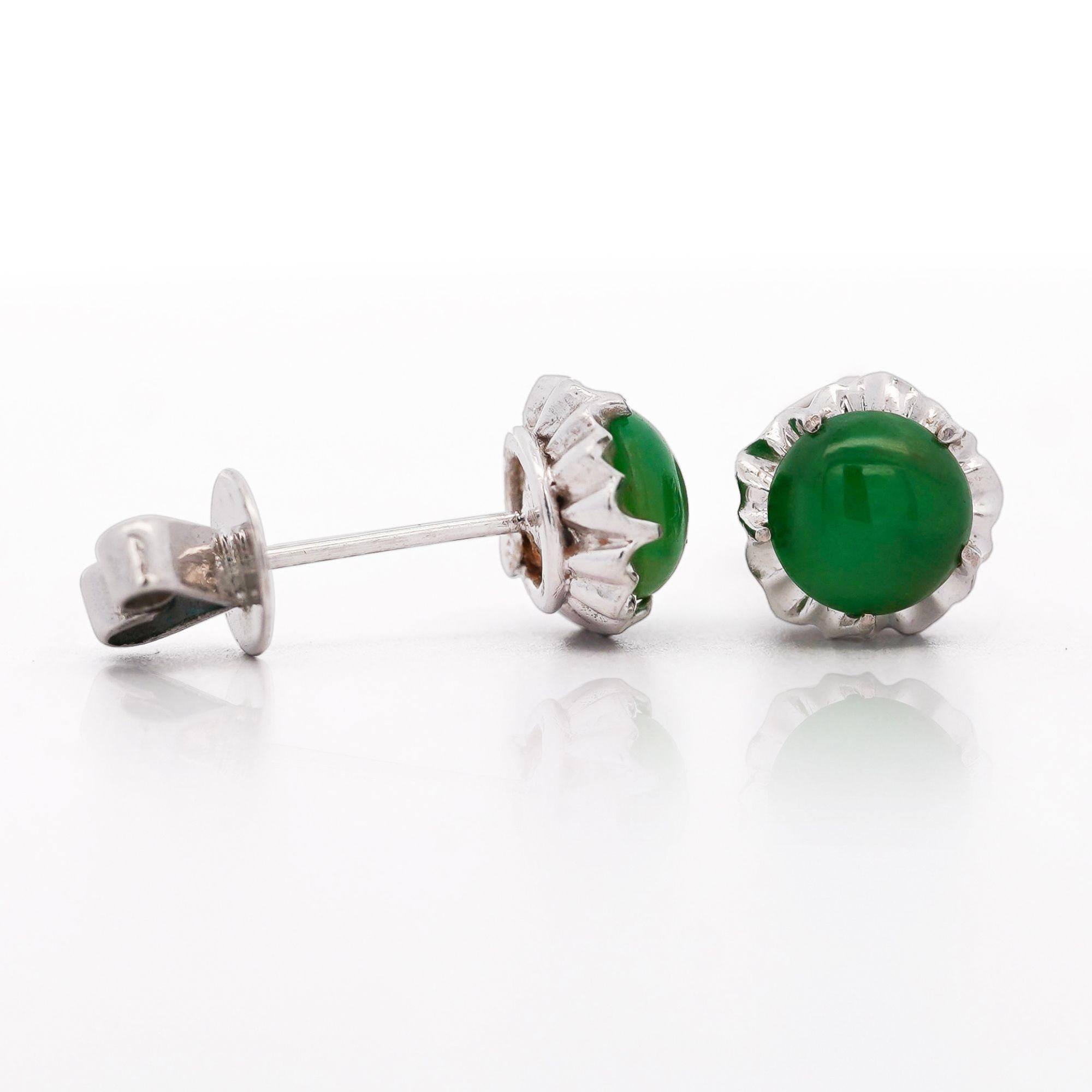 The scalloped platinum settings create delicate floral frames around each jade cabochon, adding dimensional interest to the classic stud silhouette. Premium platinum 900 combined with white gold ensures exceptional durability and hypoallergenic properties for sensitive ears. The bezel-style mounting secures each jade stone while the decorative crown edge adds vintage-inspired detail. Push-back closures provide secure, comfortable wear at 2.31 grams total weight.