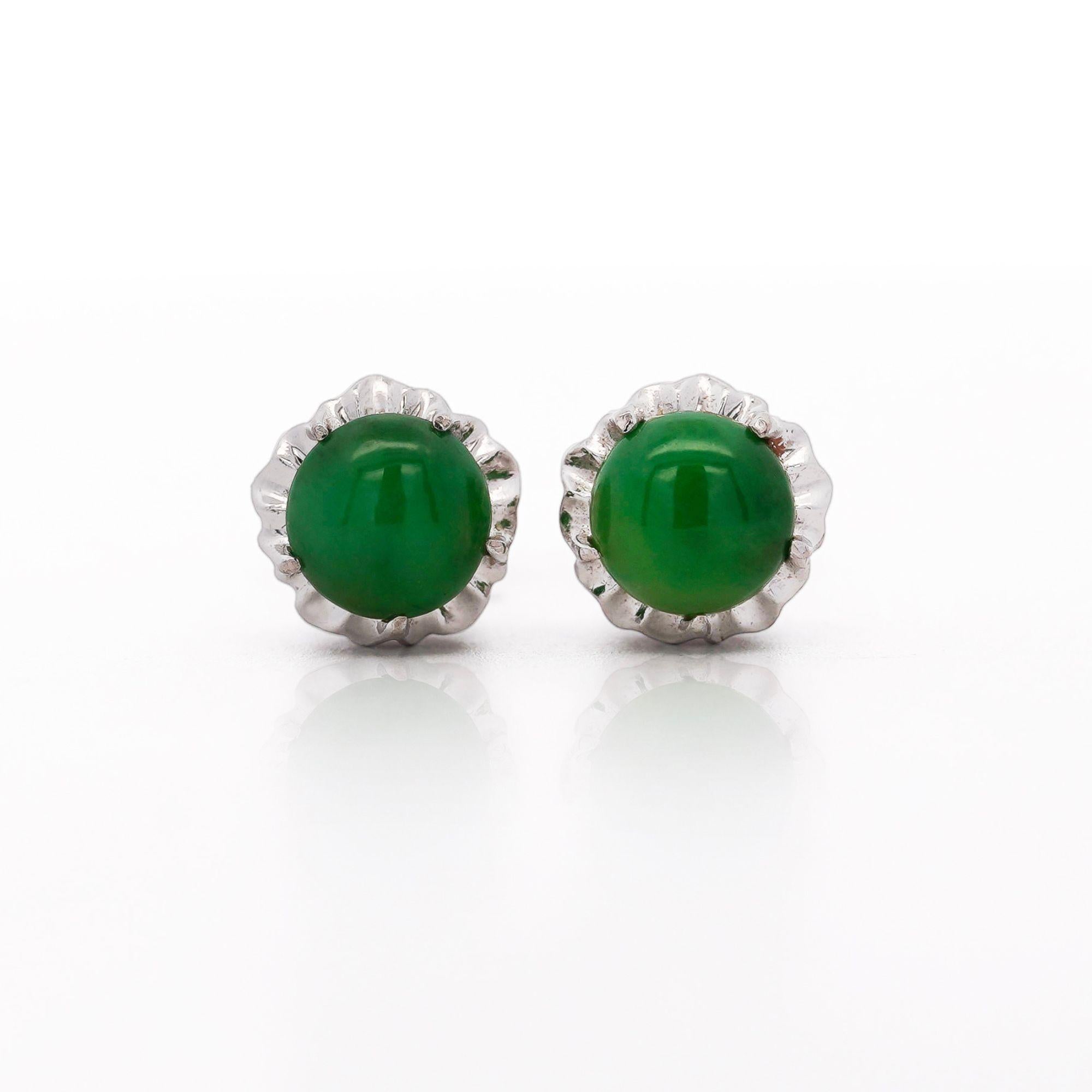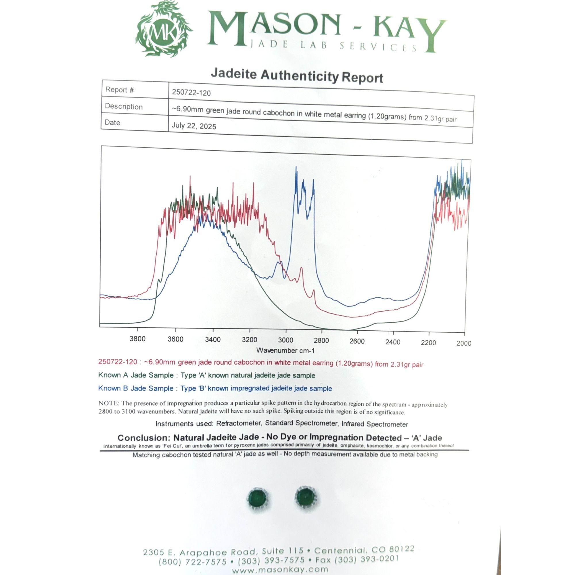 These earrings feature certified Type A natural jadeite jade in rich emerald green coloration with excellent translucency. Mason-Kay Jade Lab Services authentication confirms these stones as natural jadeite with no dye or impregnation treatment detected through refractometer, standard spectrometer, and infrared spectrometer testing. Each 6.9mm cabochon displays the characteristic smooth polish and glowing luster that defines fine jadeite quality. The untreated designation preserves the stones' natural beauty and investment value, with even color distribution and fine texture representing the most prized variety of jade in gemological classification. The translucent nature allows light to pass through the stone edges, creating an internal glow that distinguishes premium jadeite from lesser grades.