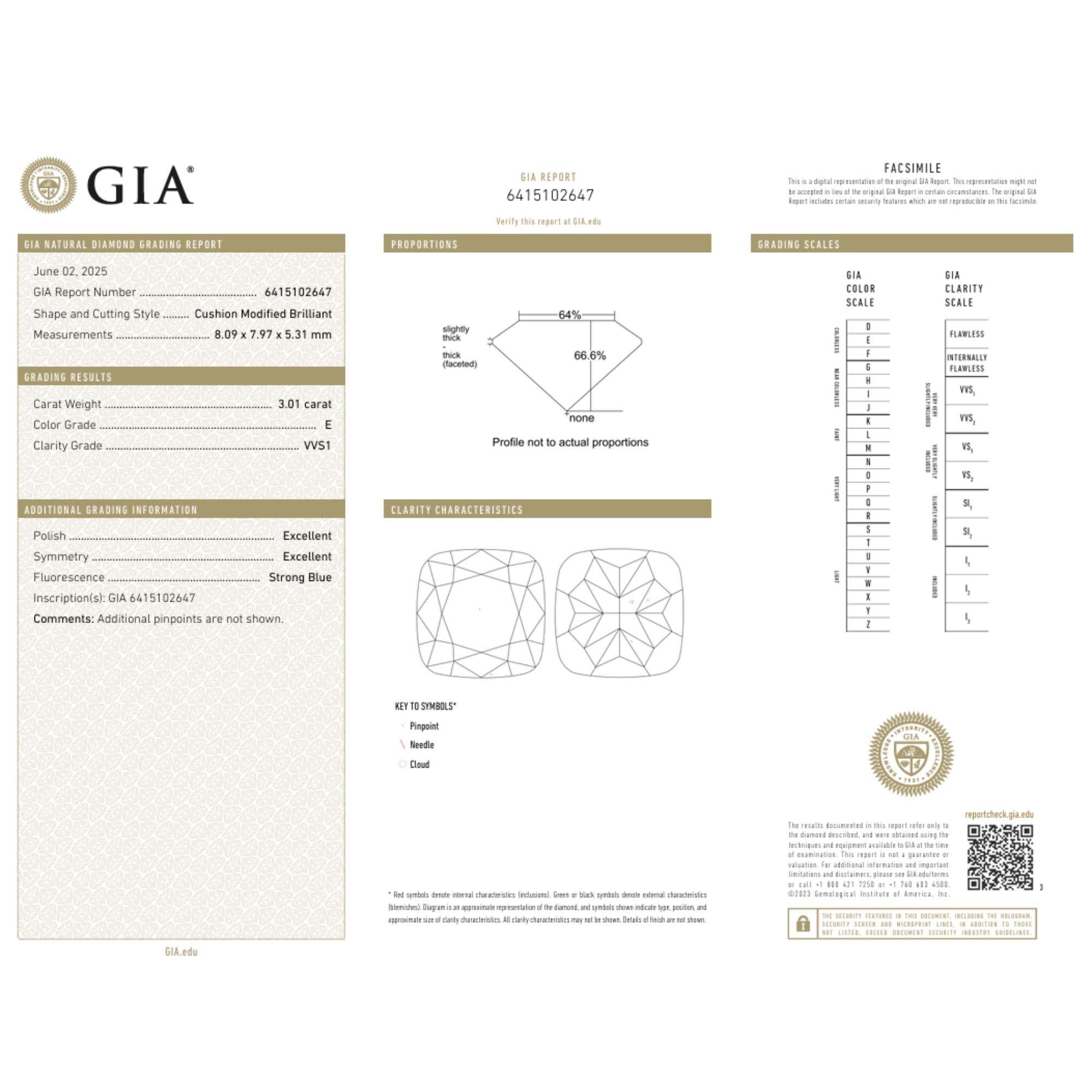 GIA certified 3.01 carat natural cushion cut diamond solitaire bezel set unisex ring in 18K white gold.