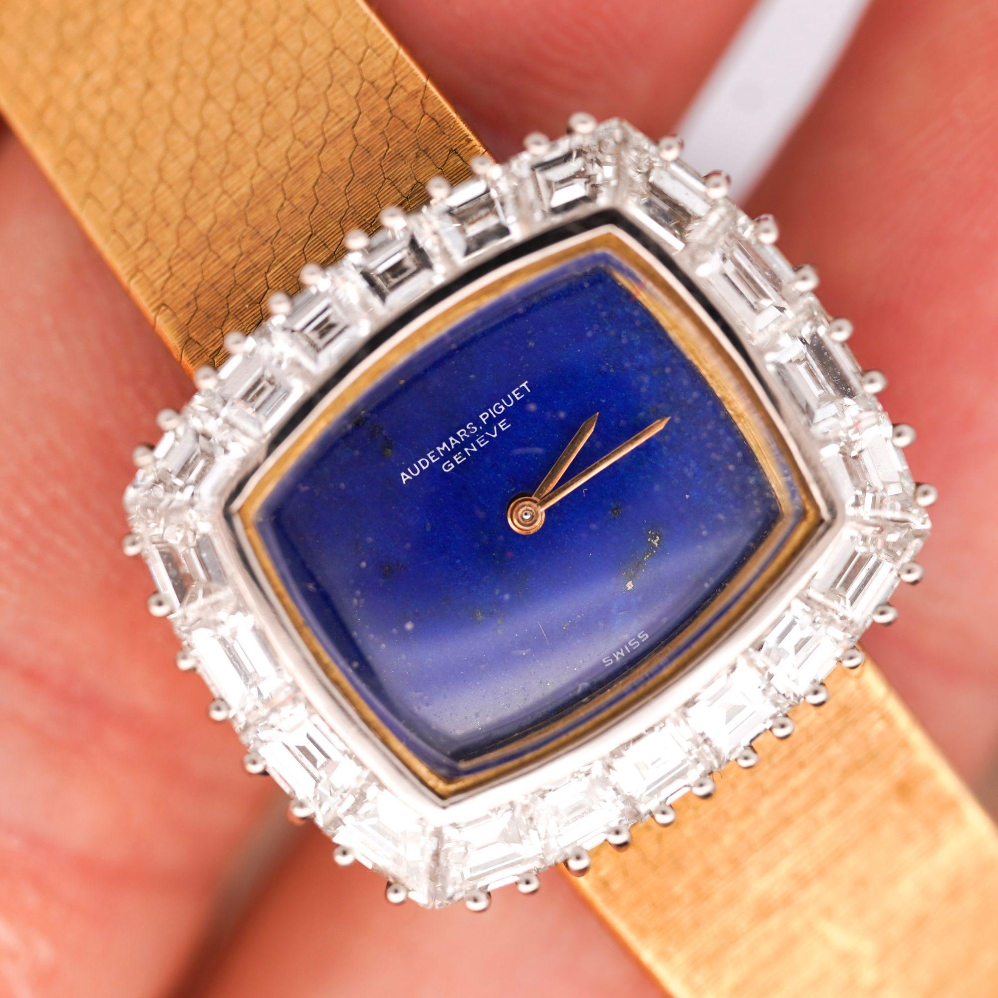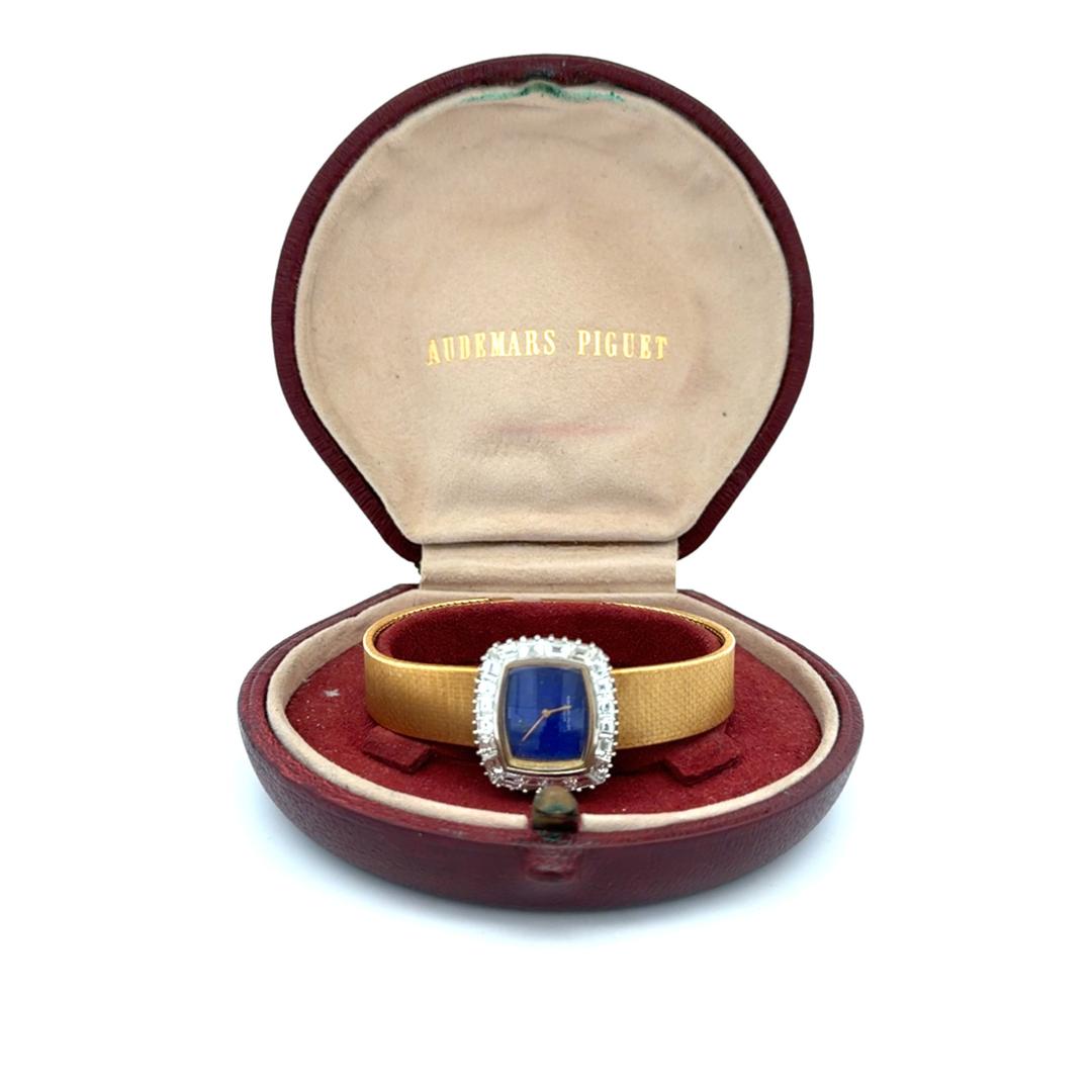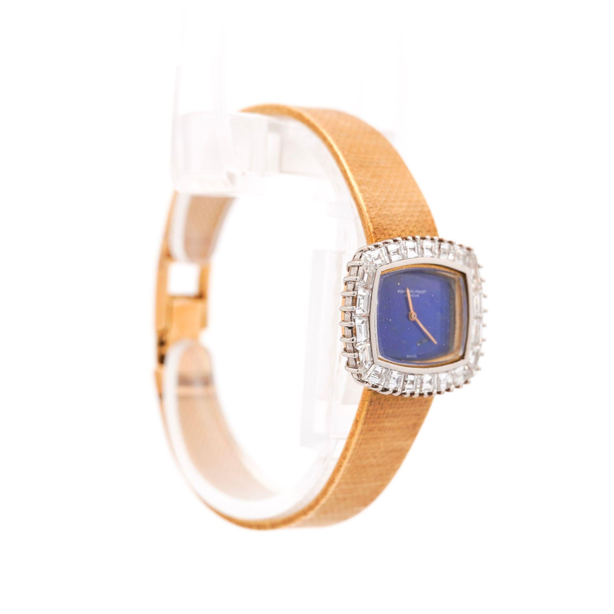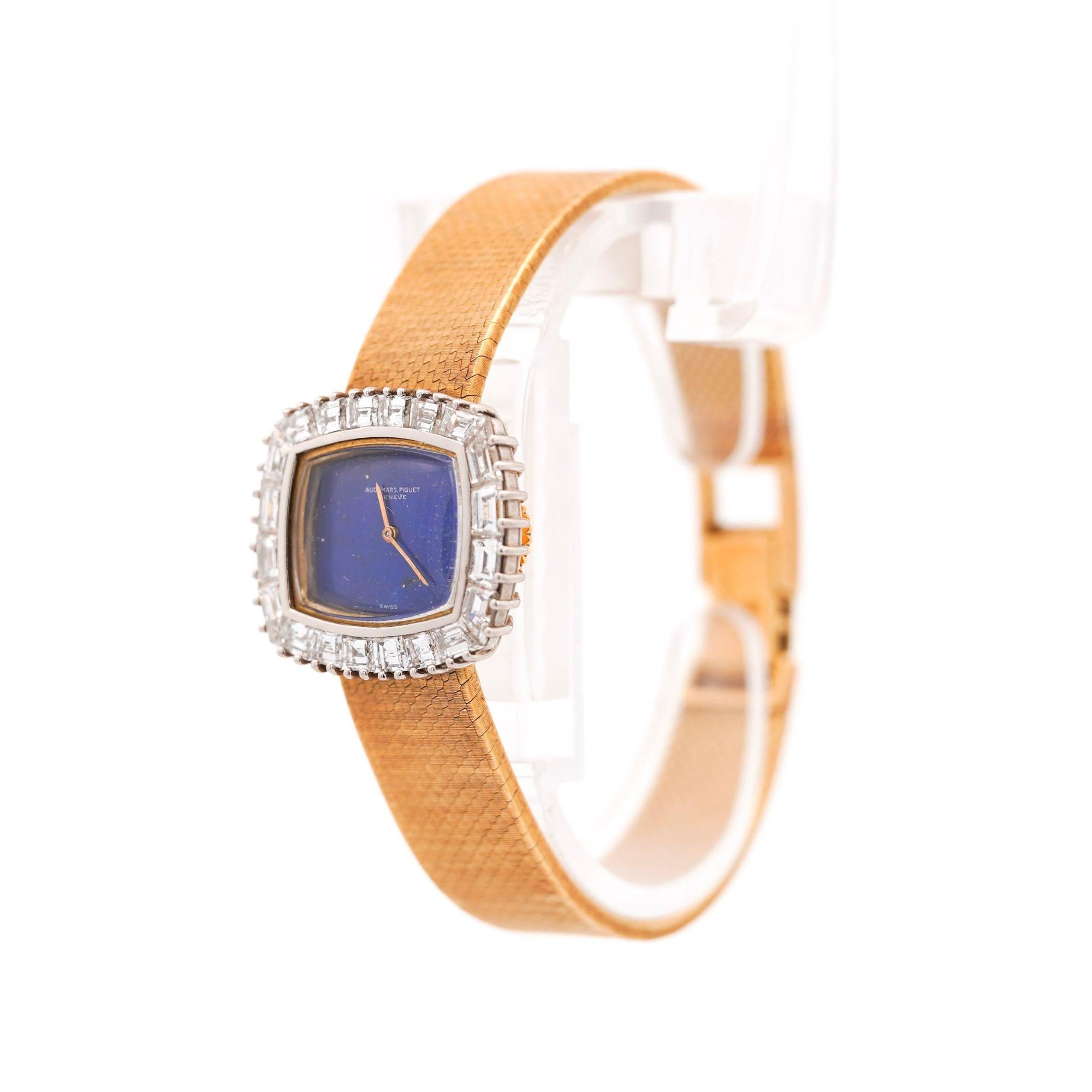 The 23 x 20mm cushion case showcases Audemars Piguet's refined proportions popular during the 1960s, combining 18K yellow gold case with contrasting 18K white gold diamond-set bezel for elegant two-tone effect. Ap Factory original Calibré-cut diamonds custom-shaped to fit the bezel's curved architecture create continuous sparkle framing the natural lapis lazuli dial, while alternating baguette and square-cut diamonds provide geometric interest. The vivid royal blue lapis lazuli dial features golden pyrite inclusions creating celestial sparkle effect, complemented by slender gold pencil hands that maintain the minimalist aesthetic. Integrated woven mesh bracelet in 18K yellow gold displays basket-weave pattern with substantial flexibility and comfort, secured by foldover clasp marked "AP" with Swiss hallmarks.