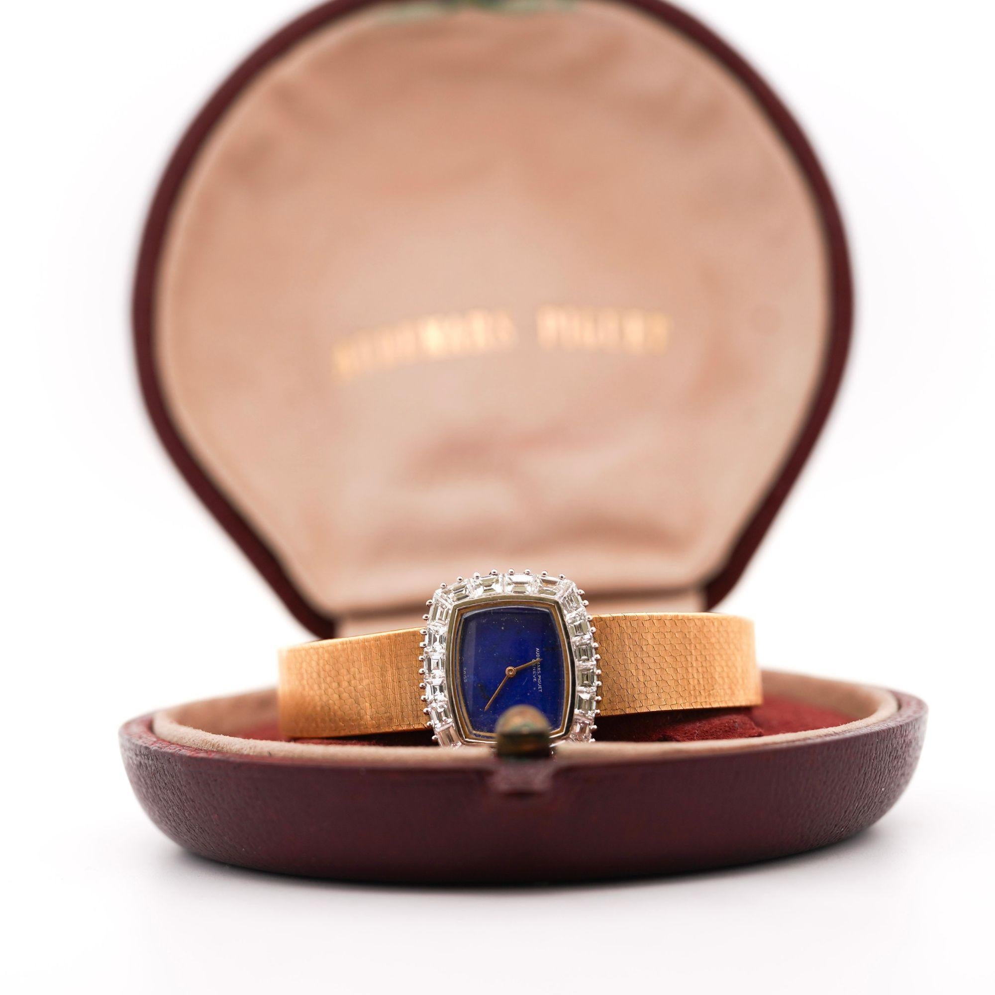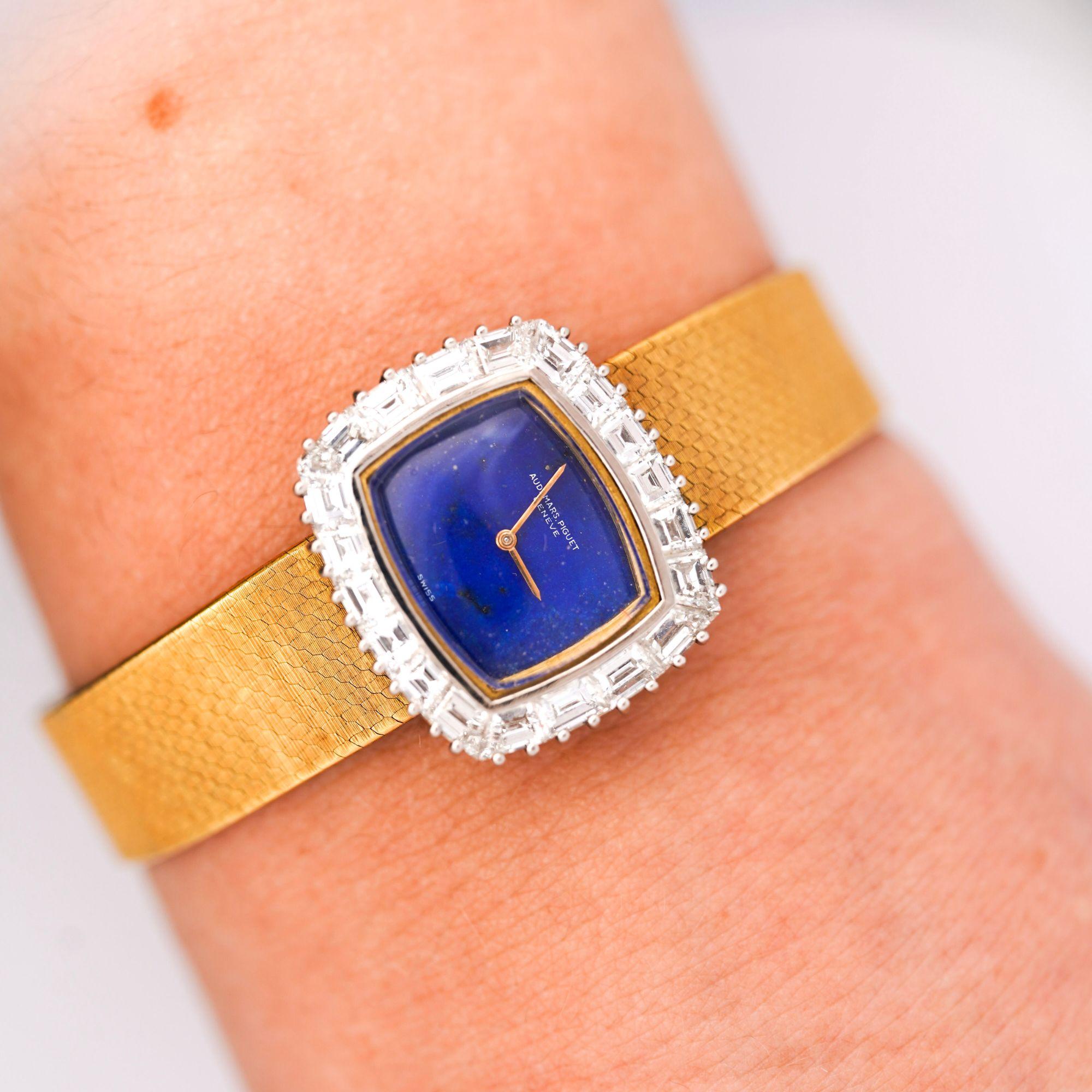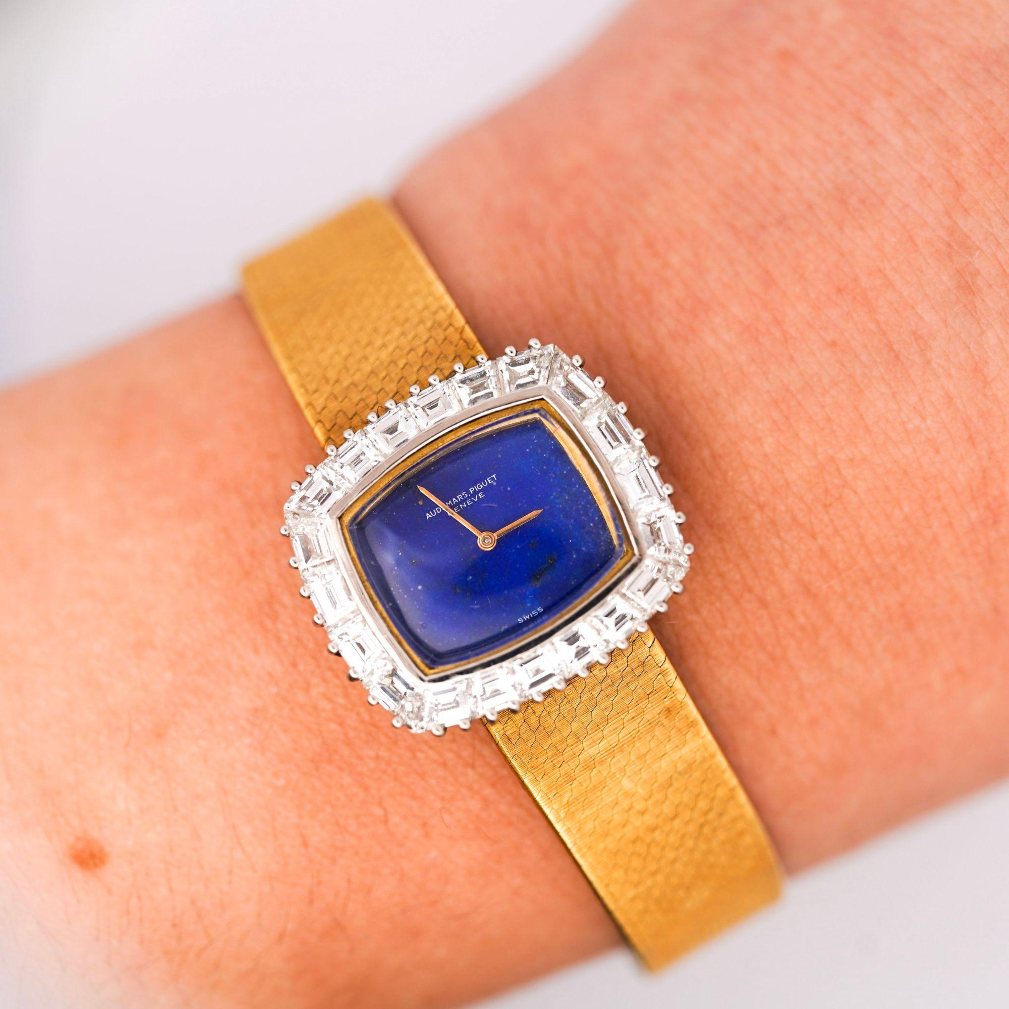 The 23 x 20mm cushion case showcases Audemars Piguet's refined proportions popular during the 1960s, combining 18K yellow gold case with contrasting 18K white gold diamond-set bezel for elegant two-tone effect. Ap Factory original Calibré-cut diamonds custom-shaped to fit the bezel's curved architecture create continuous sparkle framing the natural lapis lazuli dial, while alternating baguette and square-cut diamonds provide geometric interest. The vivid royal blue lapis lazuli dial features golden pyrite inclusions creating celestial sparkle effect, complemented by slender gold pencil hands that maintain the minimalist aesthetic. Integrated woven mesh bracelet in 18K yellow gold displays basket-weave pattern with substantial flexibility and comfort, secured by foldover clasp marked "AP" with Swiss hallmarks.