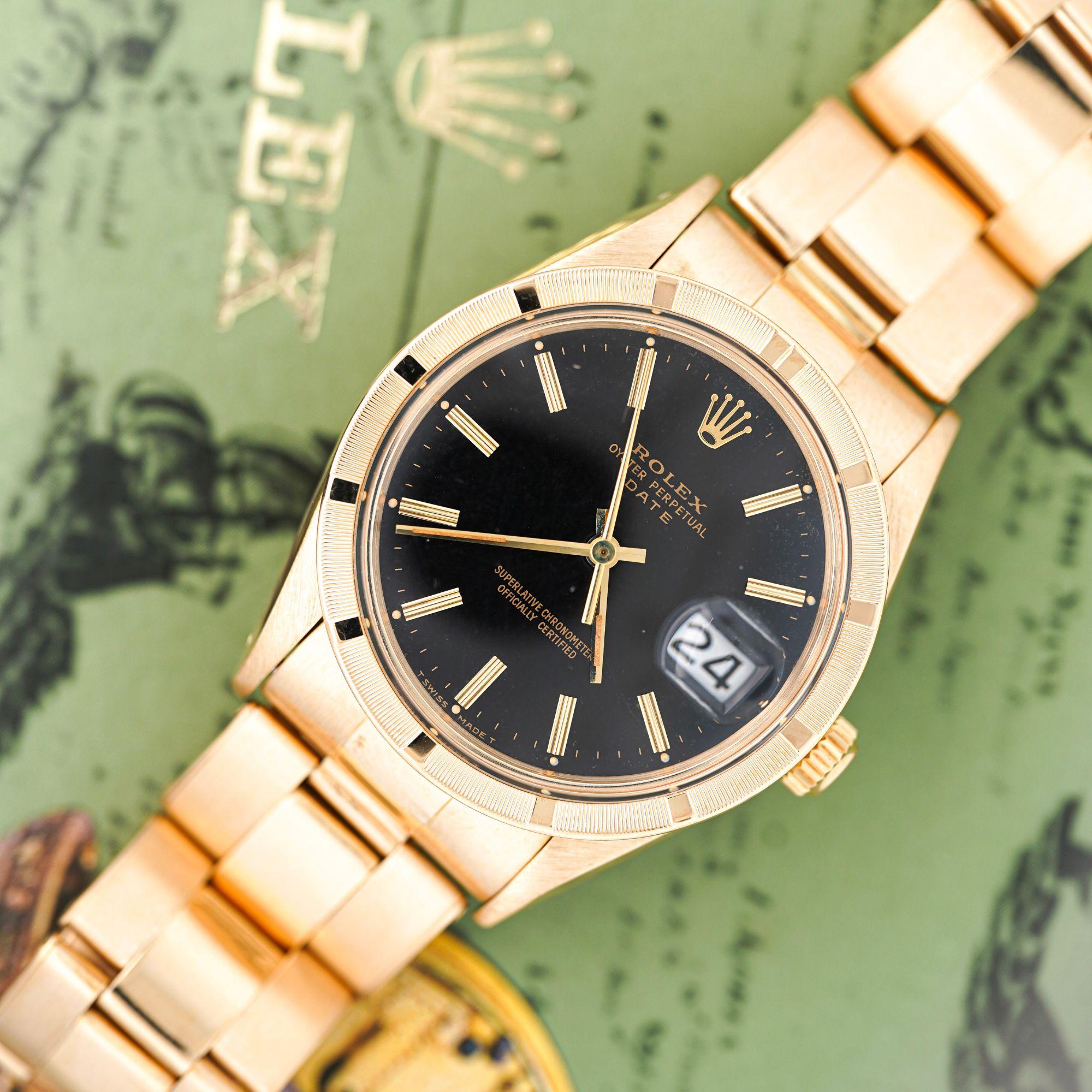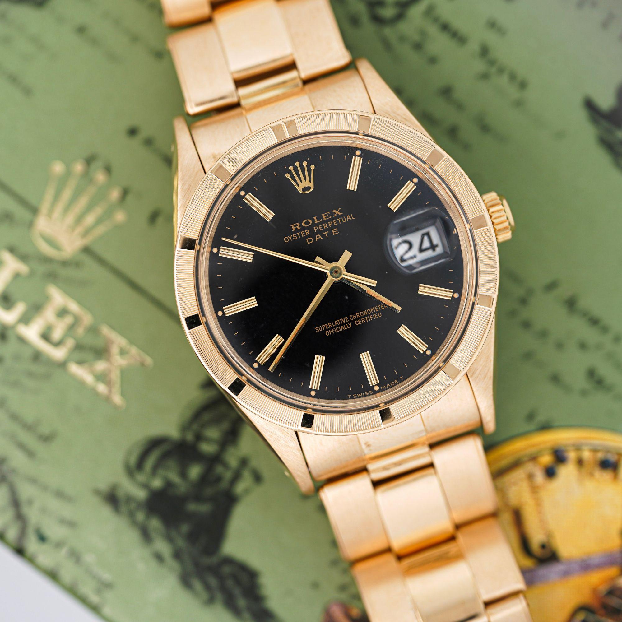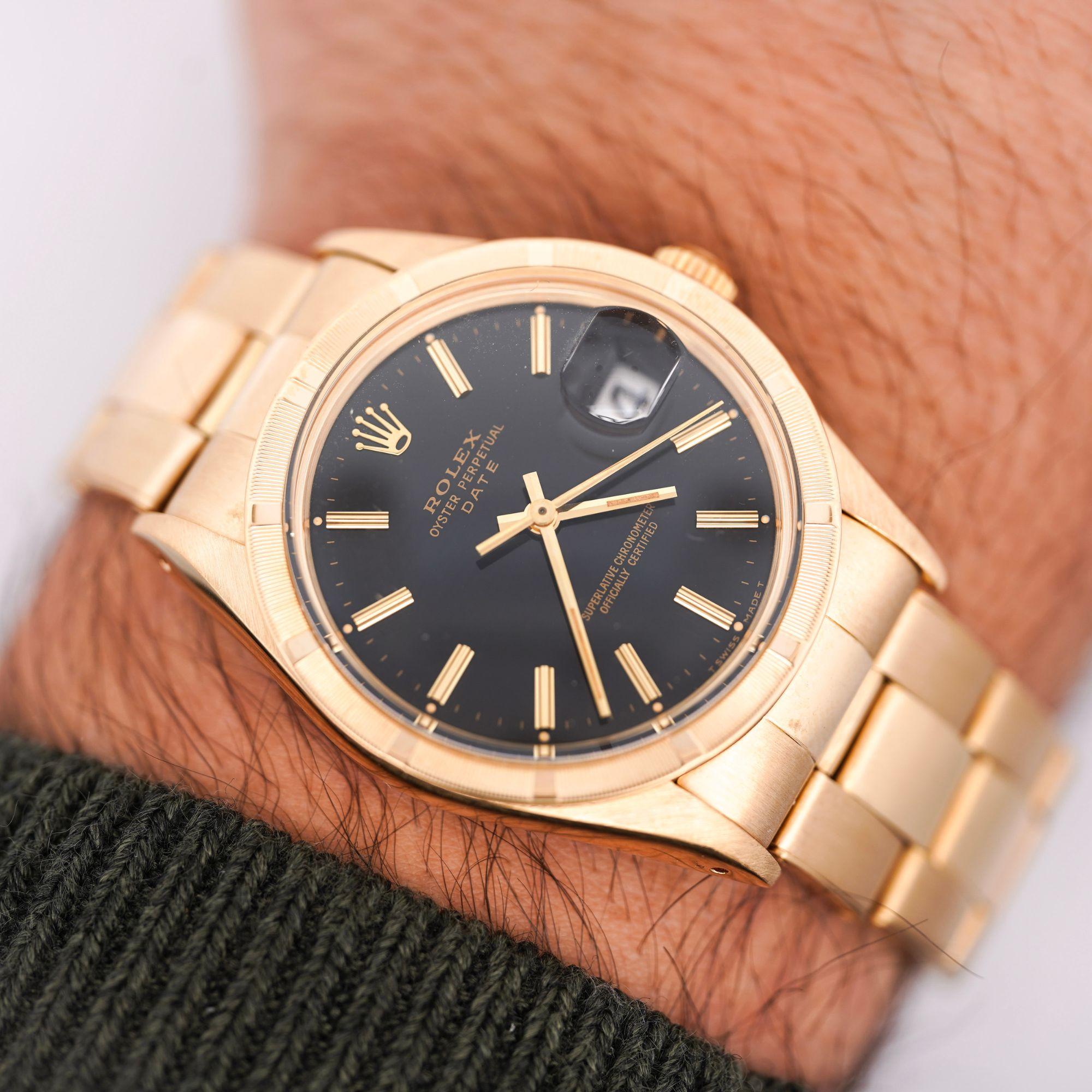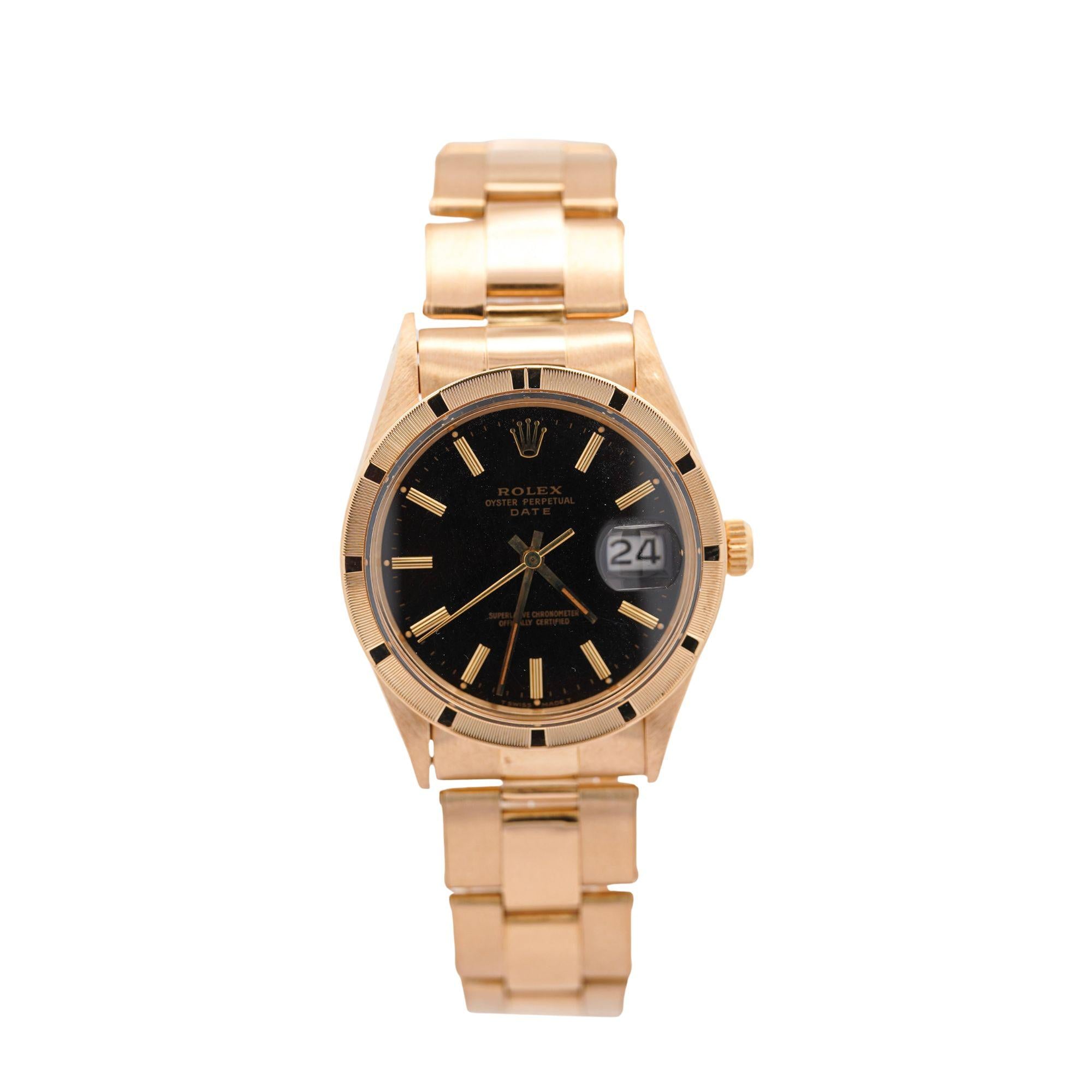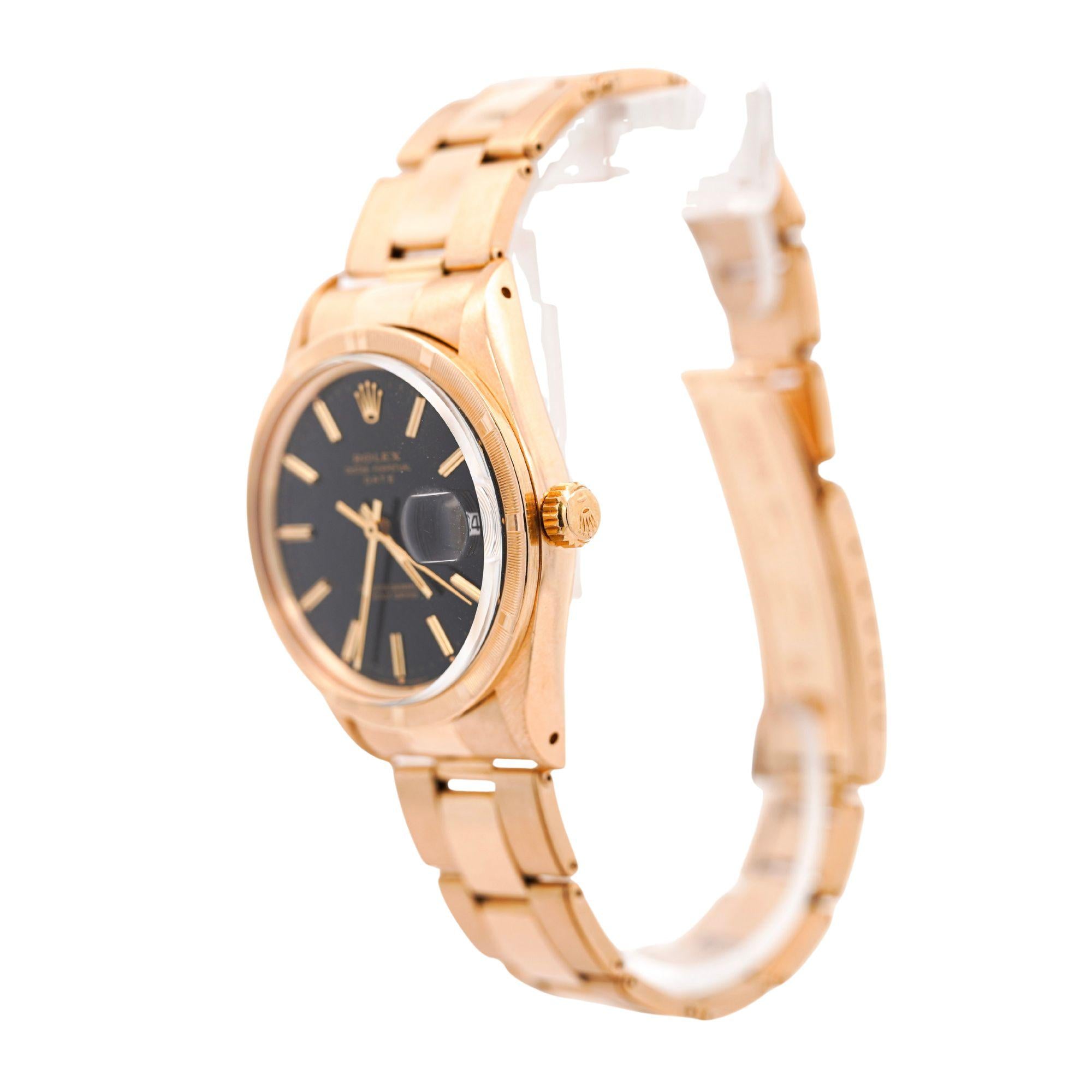 Rolex Oyster Perpetual Date featuring rare petroleum black gloss dial in 34mm 18K yellow gold case with engine-turned bezel and Oyster bracelet. European market piece weighing 104 grams in solid 18K gold, measuring 8 inches, circa 1975.