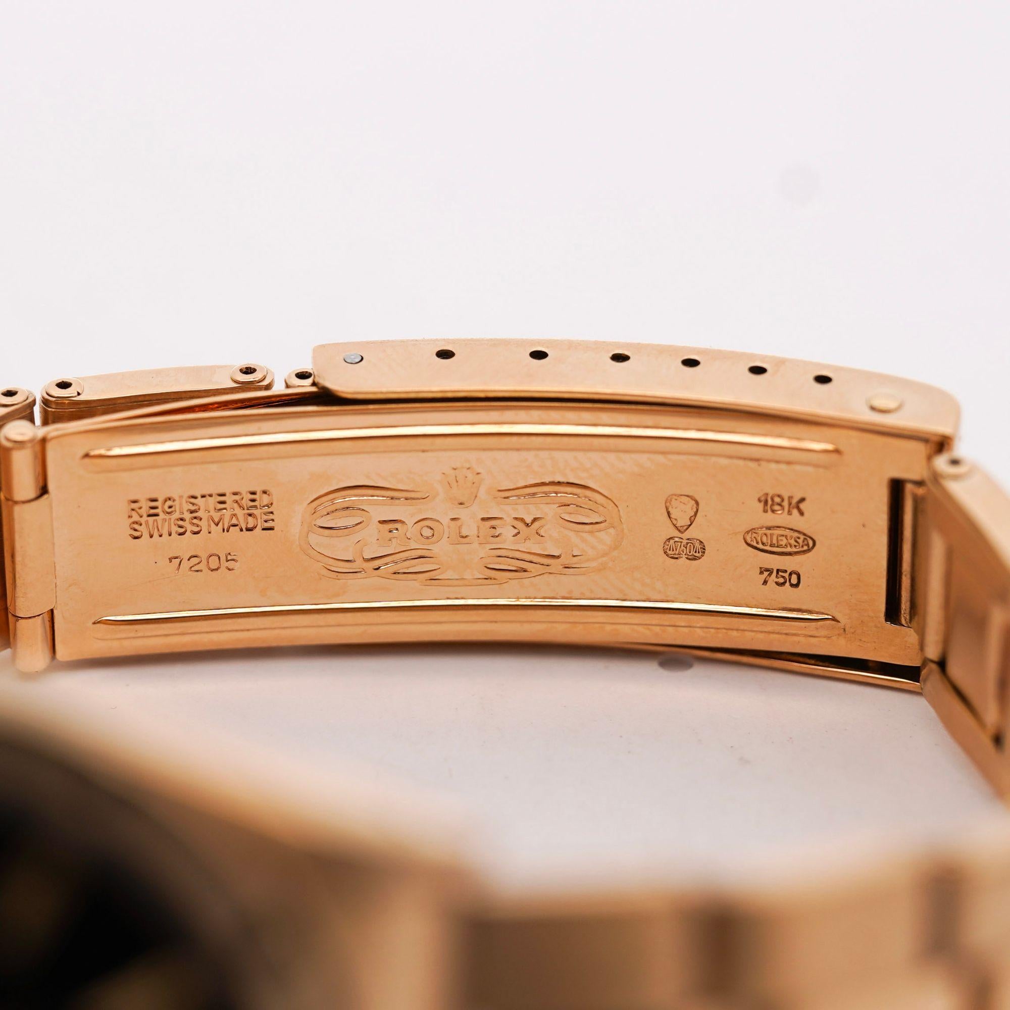 During the 1970s and 1980s, United States import regulations imposed significant taxes on gold content exceeding 14 karats, making 18K gold timepieces prohibitively expensive for American retailers. Consequently, this reference 1501 in solid 18K yellow gold was specifically manufactured for the European market where 18K gold remained the standard for luxury timepieces. The petroleum black gloss dial represents one of Rolex's most striking vintage dial variations, offering deep color saturation with glossy finish that reflects light dramatically. Reference 1501 houses the legendary caliber 1570 automatic movement, renowned for reliability and precision with 26 jewels and chronometer-grade accuracy. At 104 grams, this watch delivers substantial wrist presence that distinguishes solid gold construction from gold-plated alternatives. The engine-turned bezel adds textural sophistication while the 34mm case size represents the era's preferred proportions for dress watches, offering versatility across formal and casual contexts.